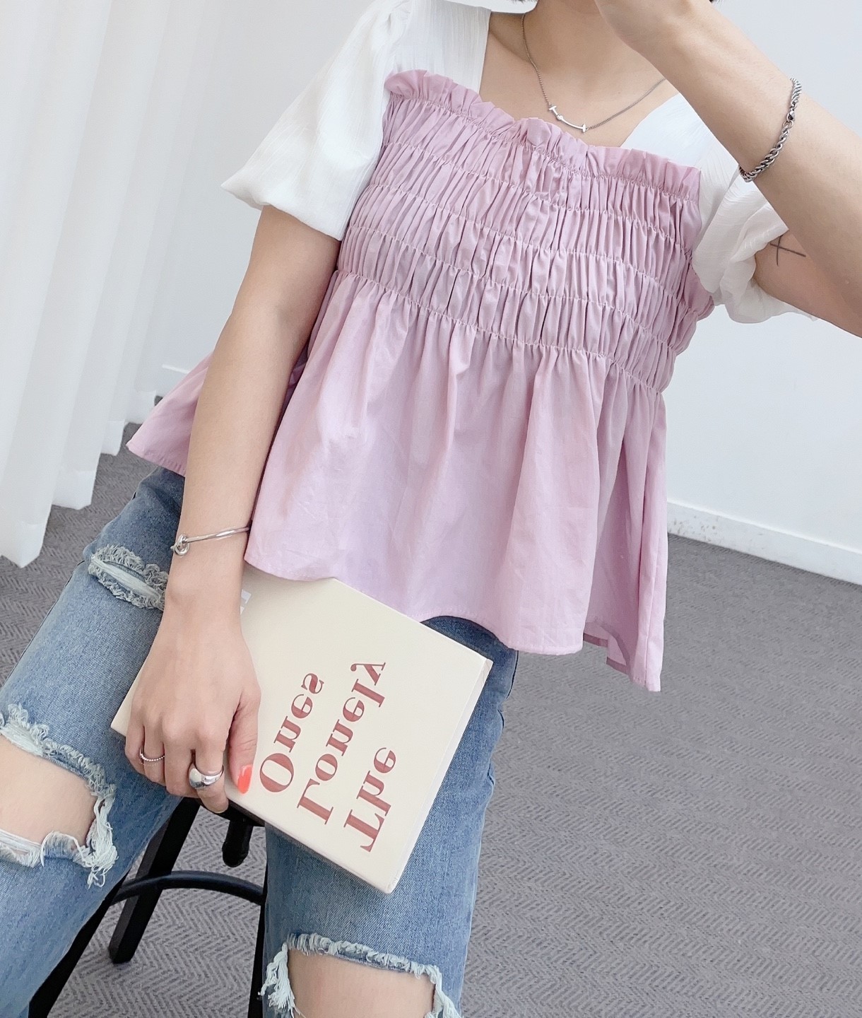 品名:스모크블라우스 #여성상의캐주얼시크로맨틱간절기봄여름피크닉룩 ◎※☞颜色:카키, 핑크 ◎※☞尺寸:FREE ◎※☞材质:纯棉 100% 翻译