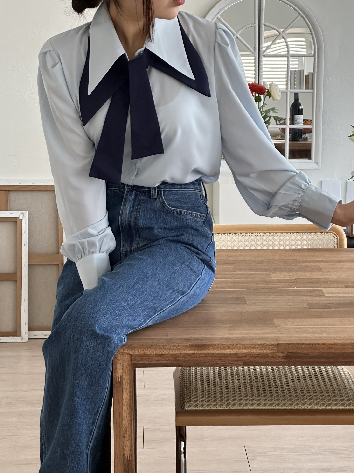 品名:비비블라우스 (타이탈부착 소매퍼프 어깨셔링 넥타이 스카프 셔츠남방 신상) ◎※☞颜色:블루, 아이보리 ◎※☞尺寸:FREE ◎※☞材质:聚酯 100% 翻译