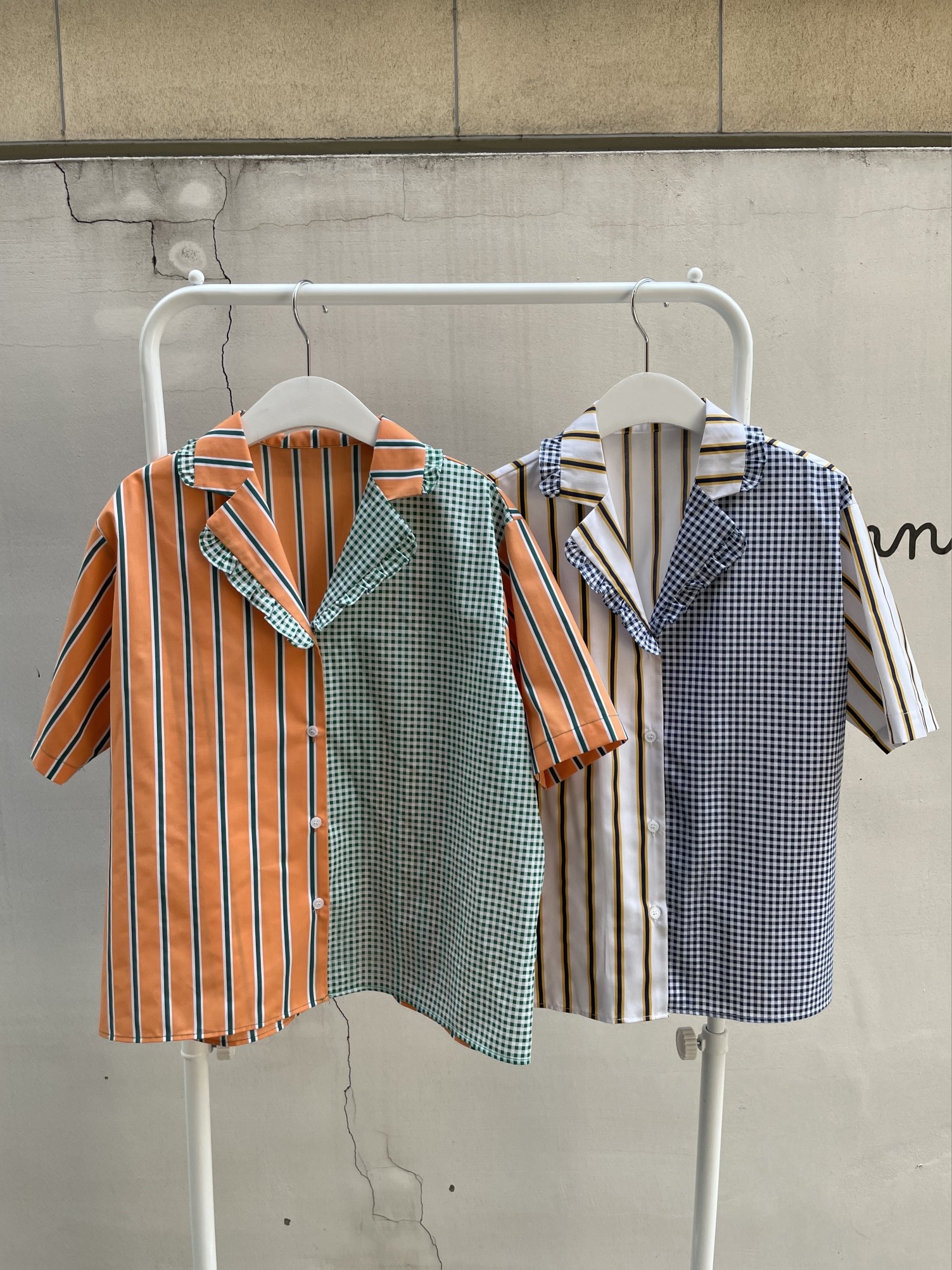 品名:케인배색남방 (프릴, 체크, 스트라이프, 셔츠, 블라우스) ◎※☞颜色:아이보리, 오렌지 ◎※☞尺寸:FREE ◎※☞材质:纯棉 100% ◎※☞注意事项:只能干洗,只能手洗,不能手洗,机洗,不能使用漂白剂,不能烘干,不能熨烫,不能曲折