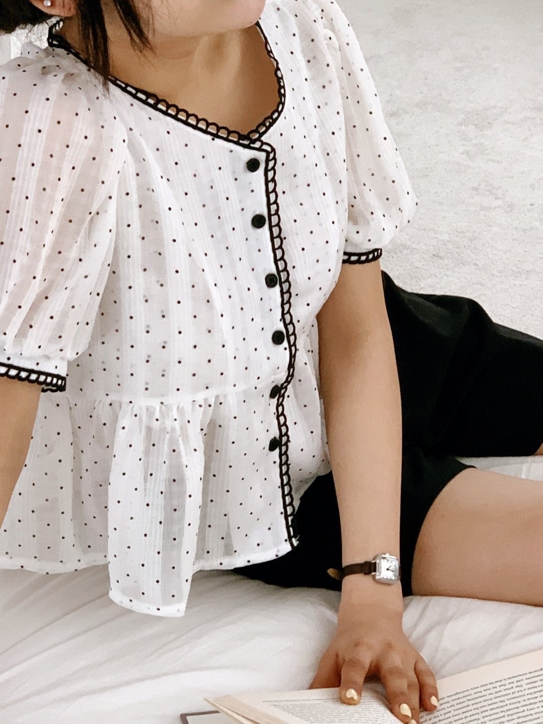 品名:미쯔블라우스 레이스 배색 펀칭 도트 ◎※☞颜色:베이지, 화이트 ◎※☞尺寸:FREE ◎※☞材质:聚酯 100% 翻译