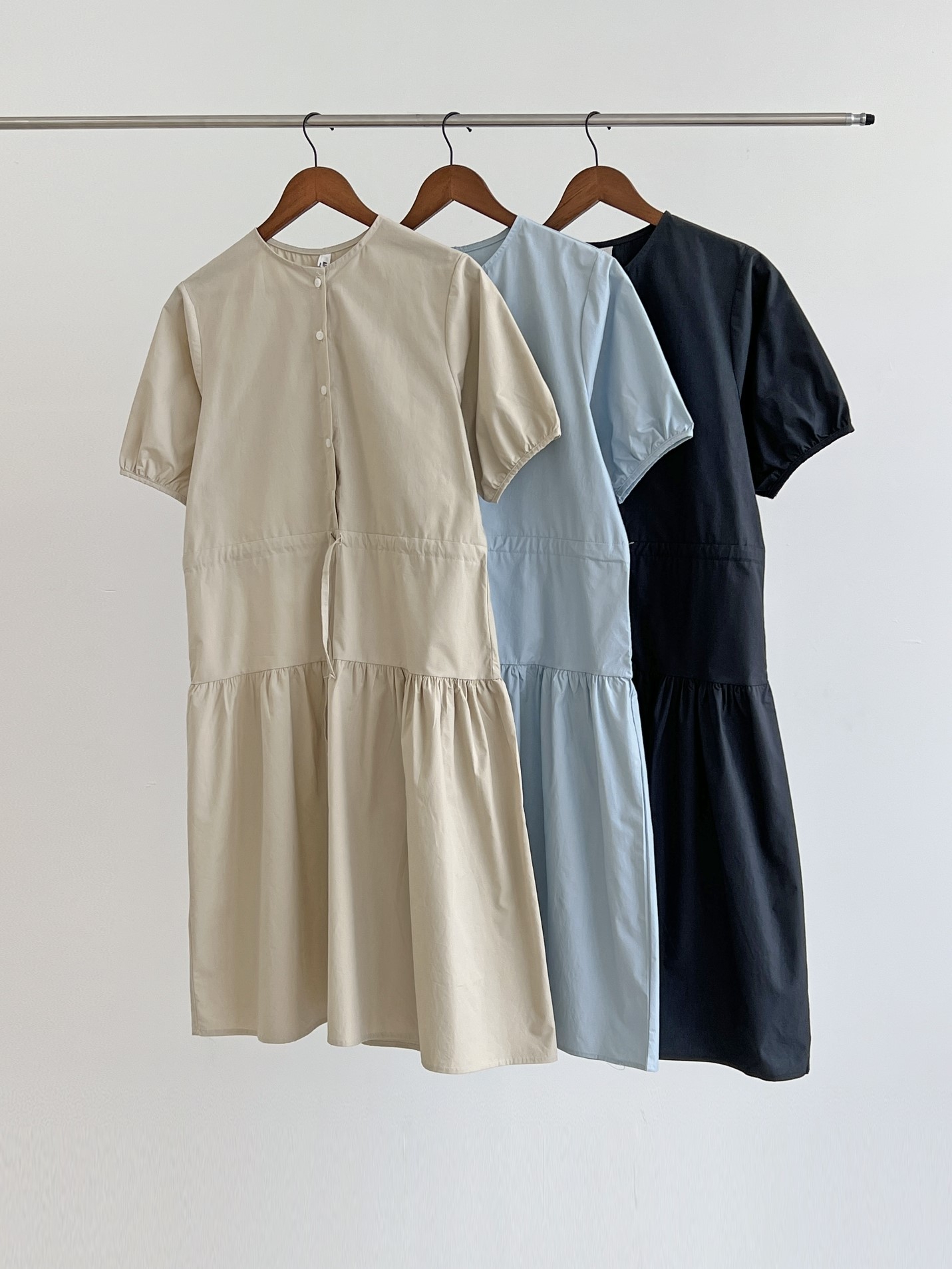 品名:纯色褶皱收腰A字连纯棉衣裙 ◎※☞颜色:네이비, 베이지, 소라 ◎※☞尺寸:FREE ◎※☞材质:纯棉 100% ◎※☞注意事项:只能干洗,只能手洗,不能手洗,机洗,不能使用漂白剂,不能烘干,不能熨烫,不能曲折