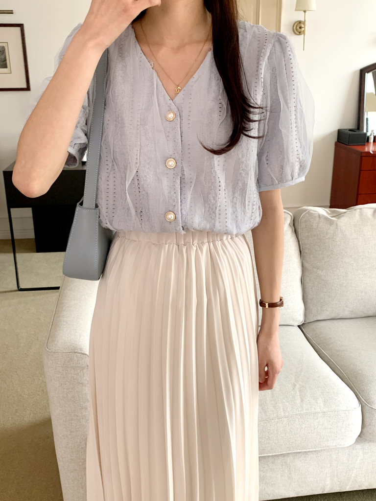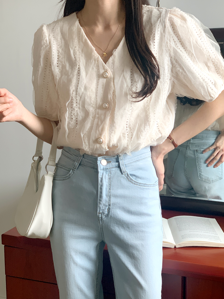 品名:纯色简约V领短袖衬衫上衣 ◎※☞颜色:소라, 아이보리 ◎※☞尺寸:FREE ◎※☞材质:聚酯 98%,弹力 2% 翻译