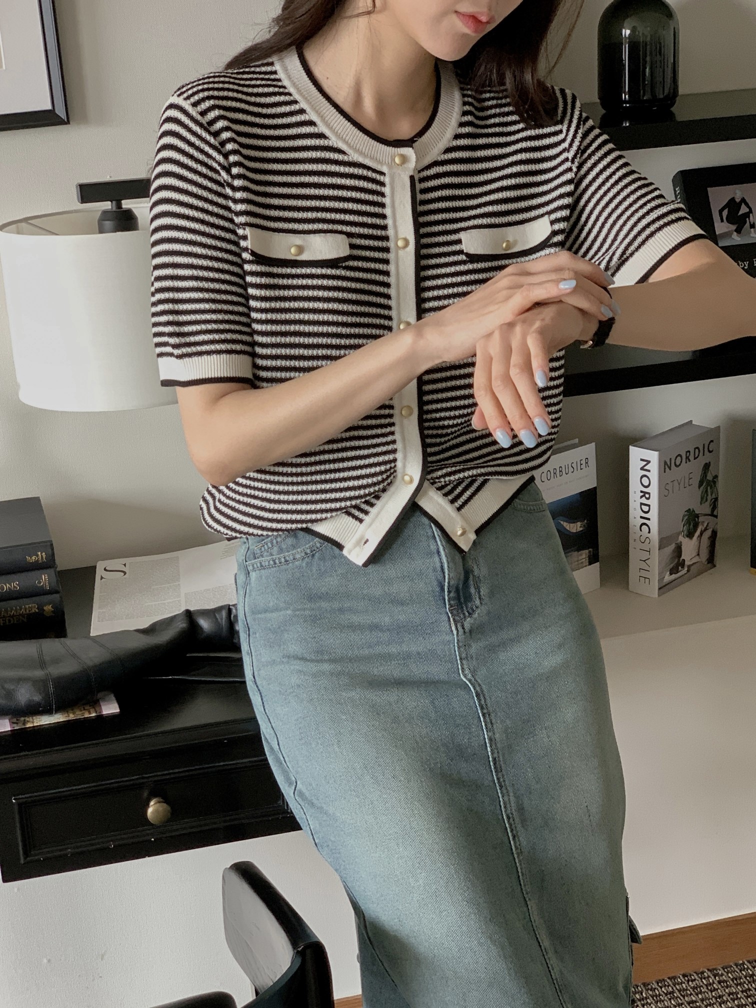 品名:2023SS 봄신상 - 링클 스트라이프 반팔 니트 가디건 ◎※☞颜色:블랙, 옐로우 ◎※☞尺寸:FREE ◎※☞材质:纯棉 40%,聚酯 60% 翻译