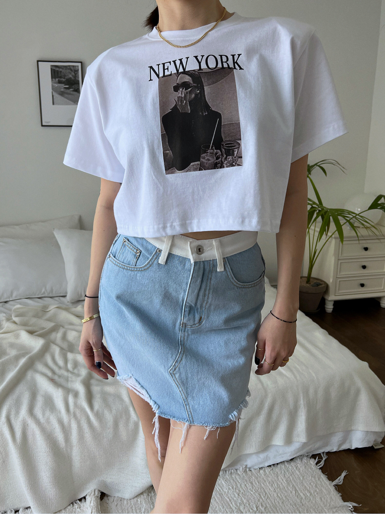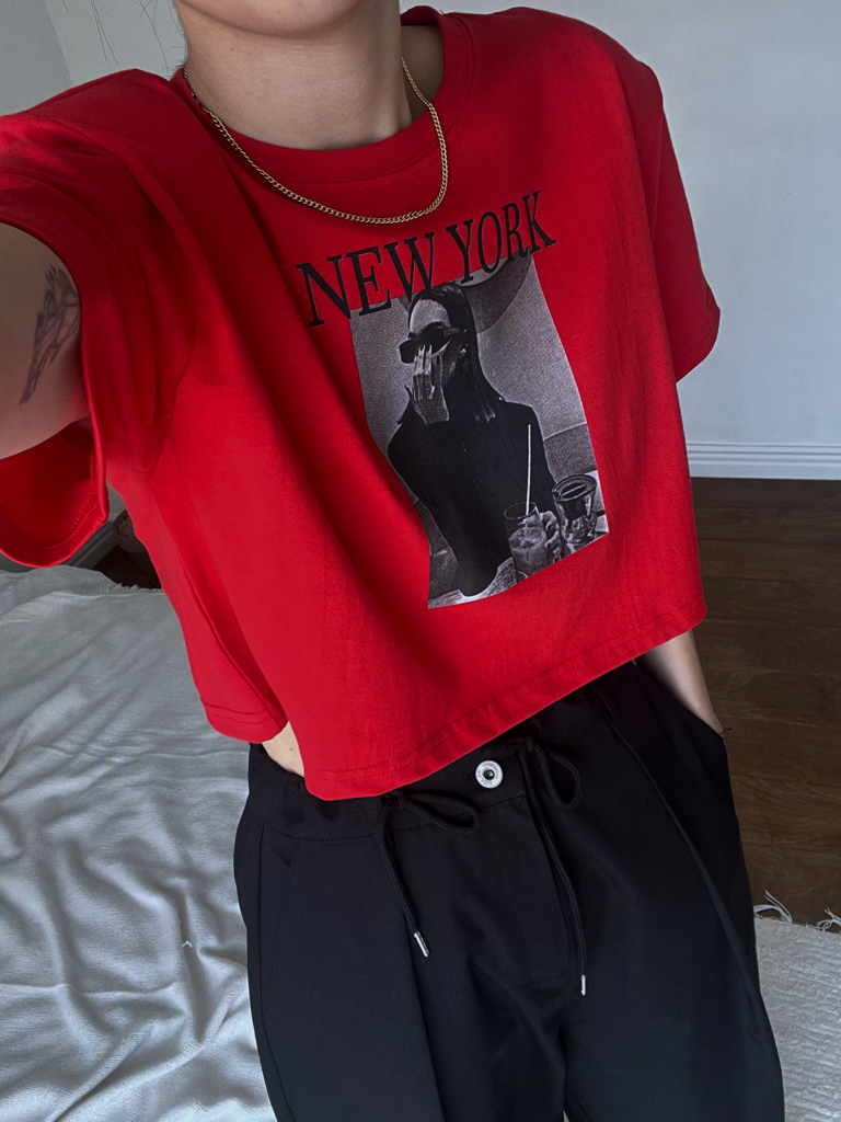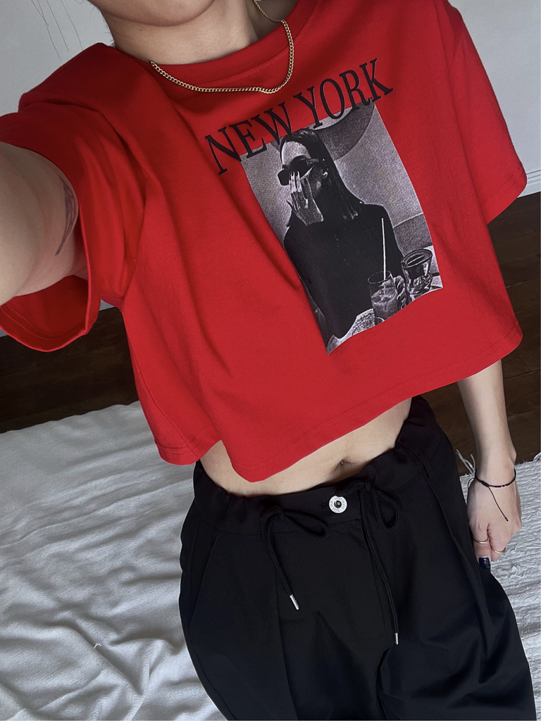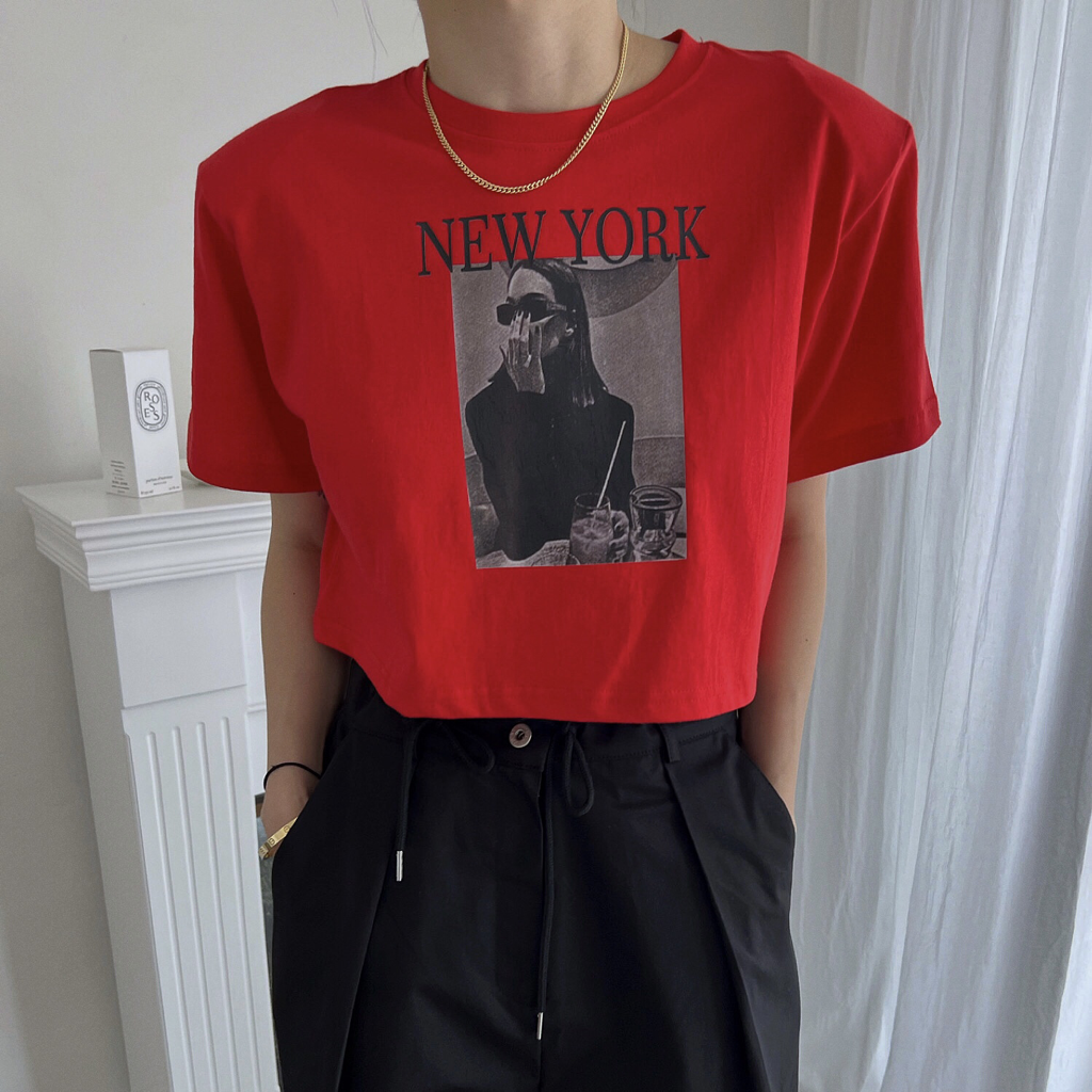 品名:뉴욕크롭티 ◎※☞颜色:검정, 그레이, 레드, 화이트 ◎※☞尺寸:FREE ◎※☞材质:纯棉 100% 翻译