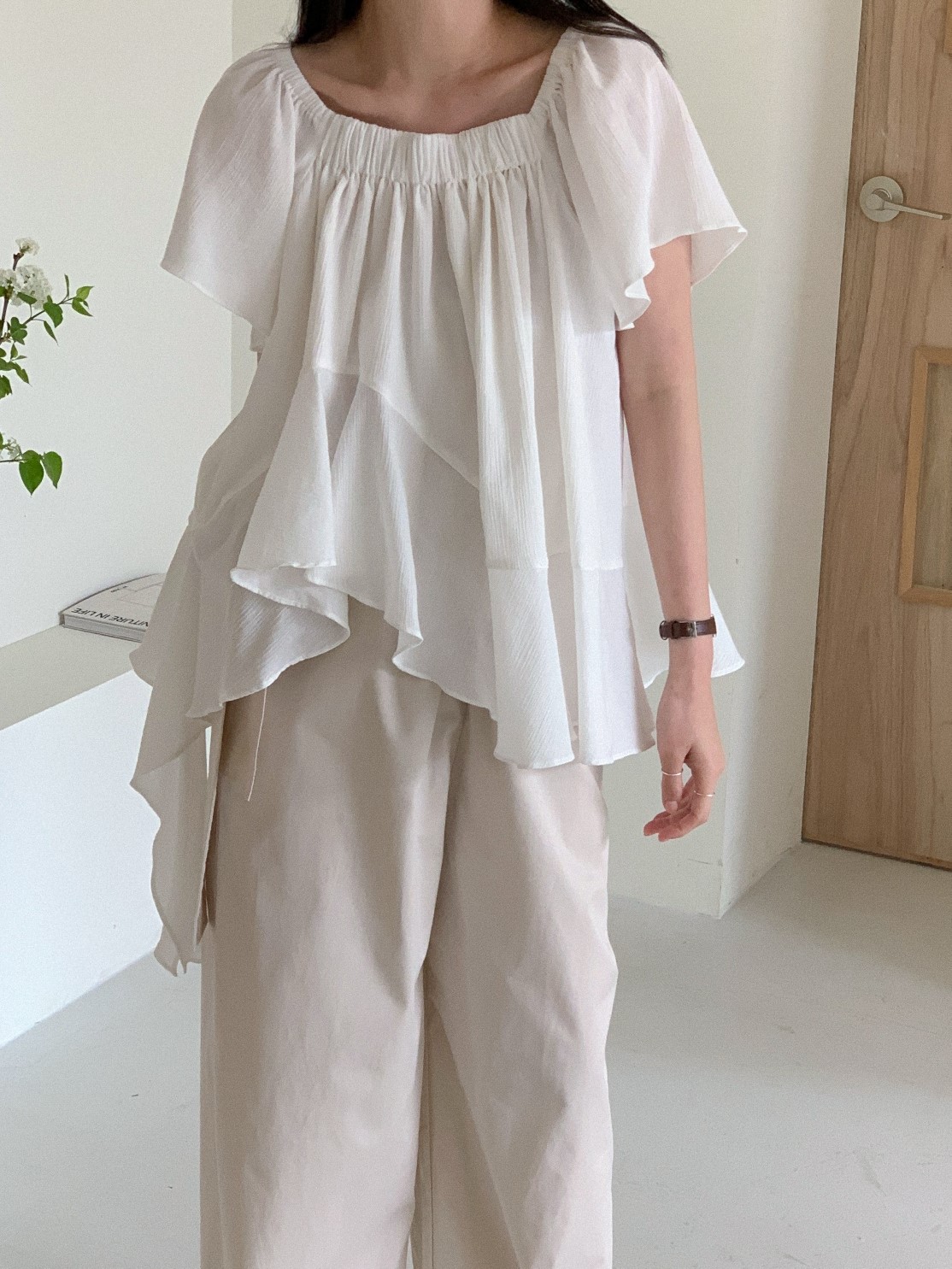 品名:[23년 봄여름 신상] 스퀘어넥 언발 러플 블라우스 ◎※☞颜色:블랙, 아이보리 ◎※☞尺寸:FREE ◎※☞材质:纯棉 100% ◎※☞注意事项:只能干洗,只能手洗,不能手洗,机洗,不能使用漂白剂,不能烘干,不能熨烫,不能曲折