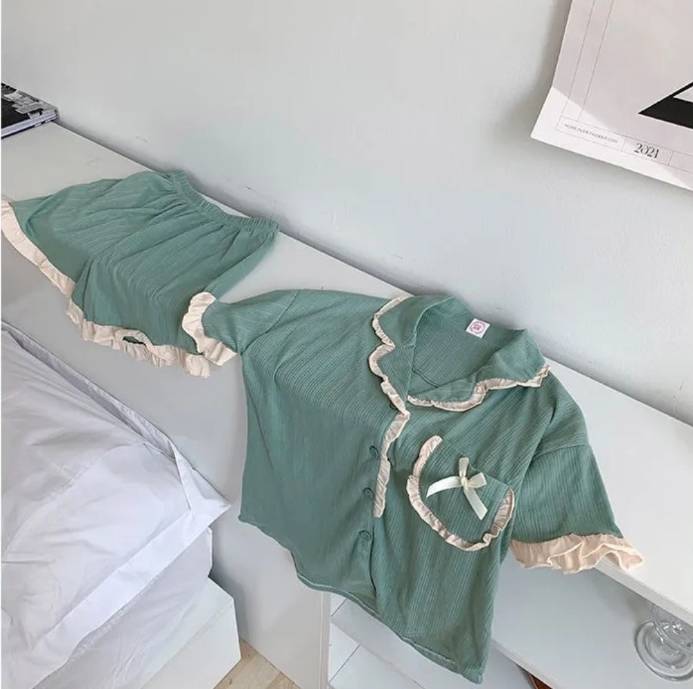 品名:봄신상 링클프릴3번 잠옷 홈웨어 파자마세트 ◎※☞颜色:민트, 아이 ◎※☞尺寸:FREE ◎※☞材质:纯棉 20%,聚酯 80% 翻译