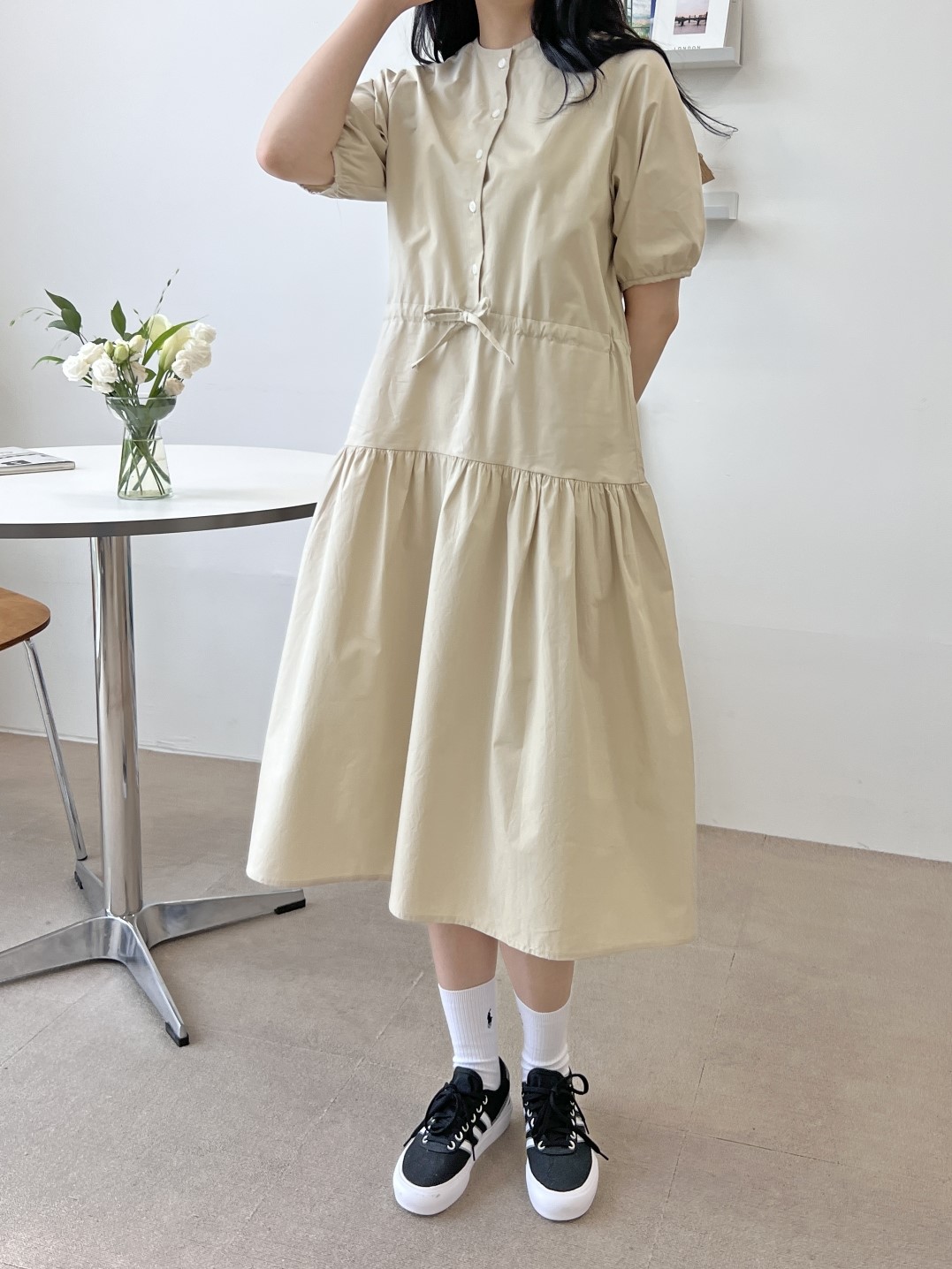 品名:纯色褶皱收腰A字连纯棉衣裙 ◎※☞颜色:네이비, 베이지, 소라 ◎※☞尺寸:FREE ◎※☞材质:纯棉 100% ◎※☞注意事项:只能干洗,只能手洗,不能手洗,机洗,不能使用漂白剂,不能烘干,不能熨烫,不能曲折
