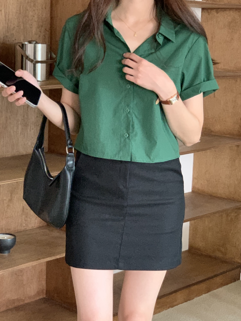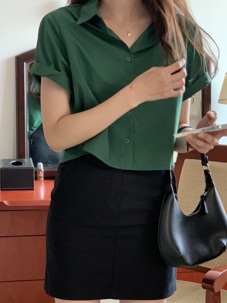 品名:백슬릿반팔남방#크롭남방#뒷트임#크롭블라우스 ◎※☞颜色:그린, 베이지, 블랙, 소라, 아이 ◎※☞尺寸:FREE ◎※☞材质:纯棉 100% 翻译