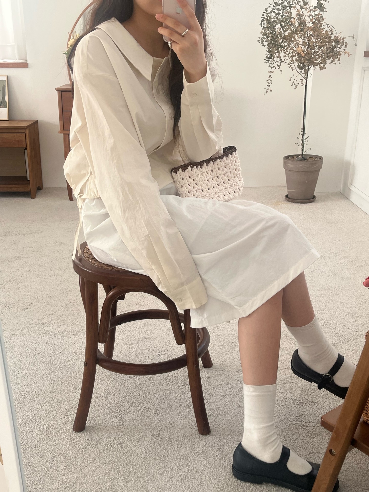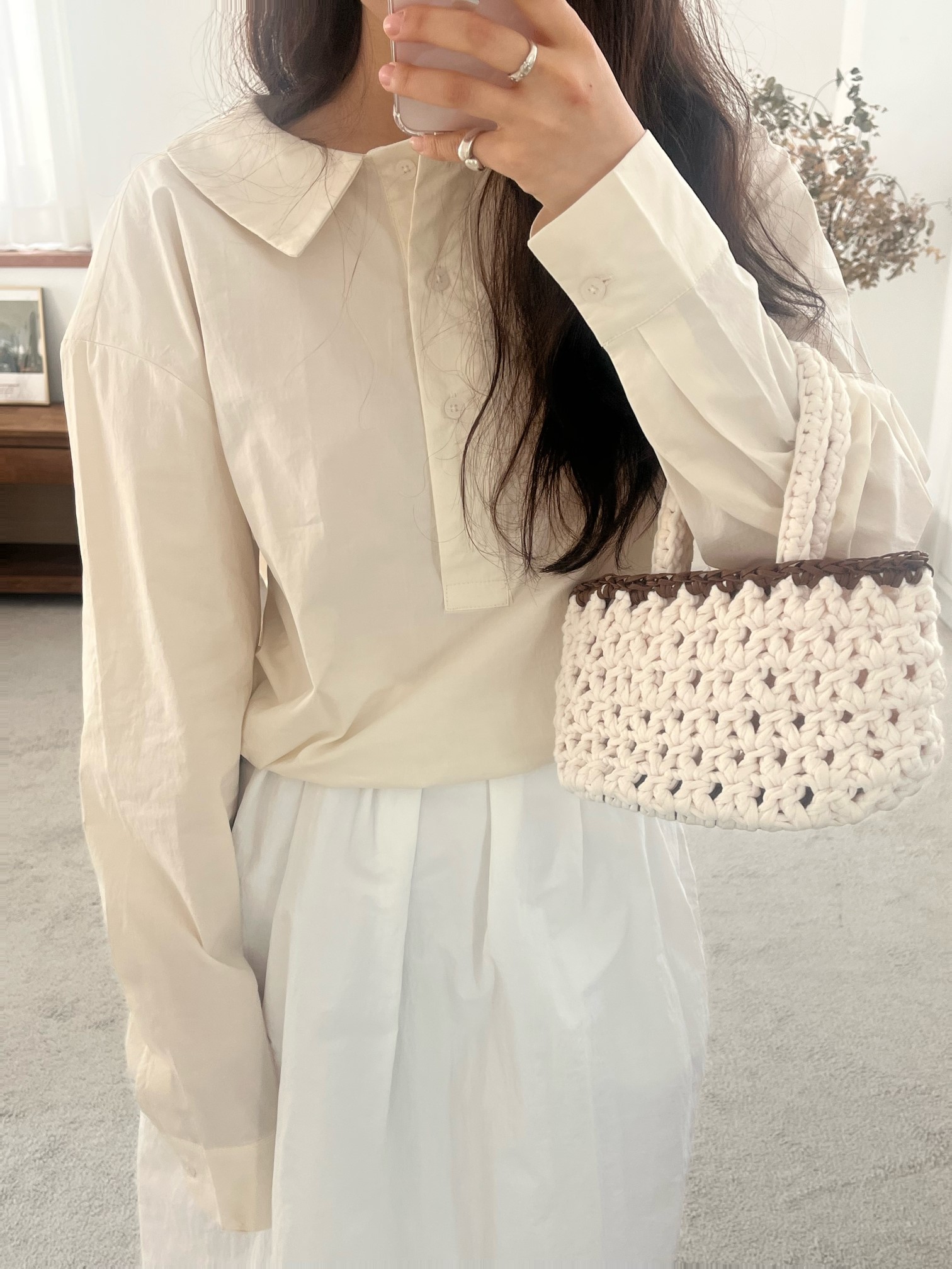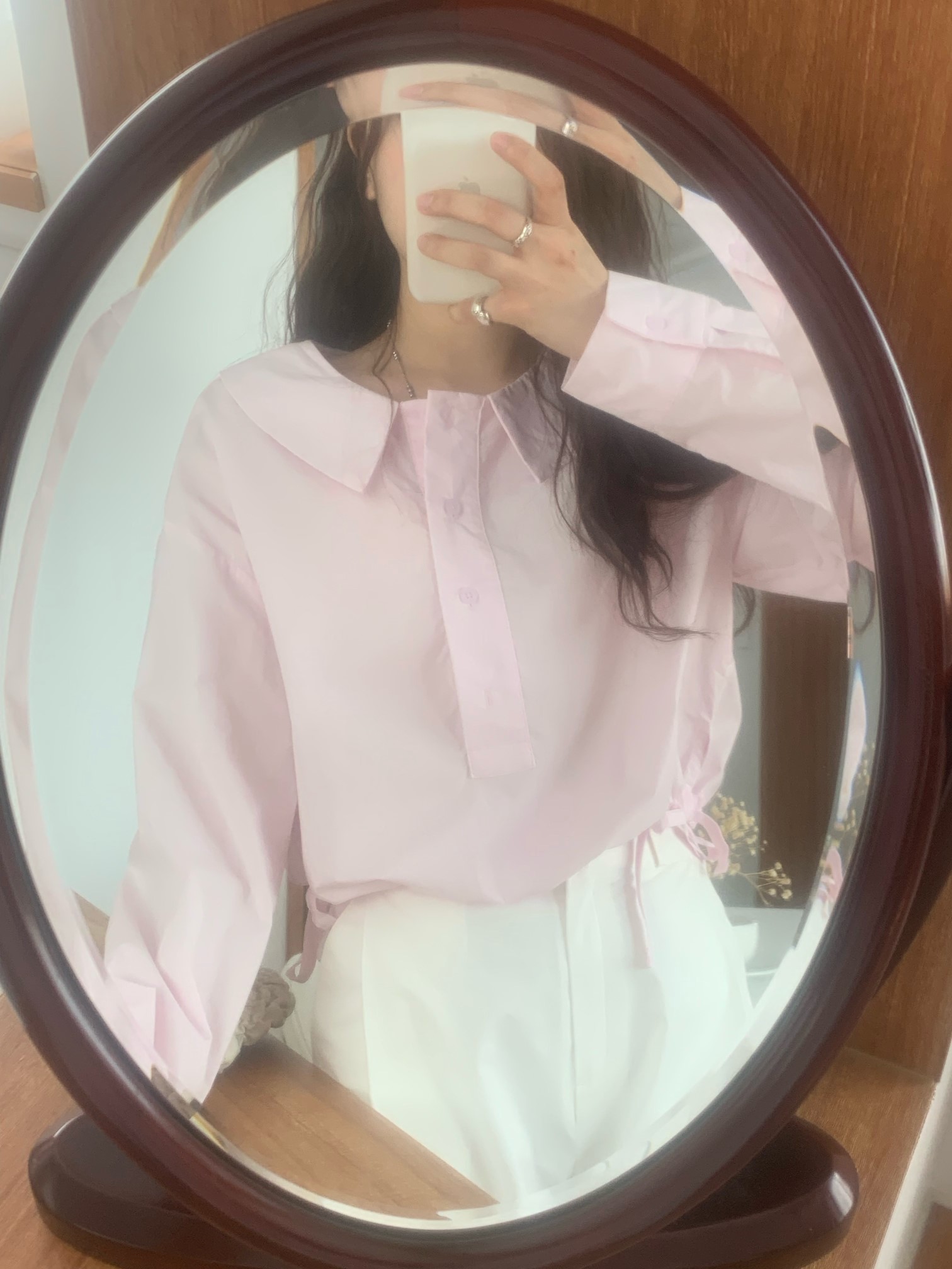 品名:카라 스트링 블라우스 ◎※☞颜色:베이지, 핑크 ◎※☞尺寸:FREE ◎※☞材质:纯棉 100% 翻译