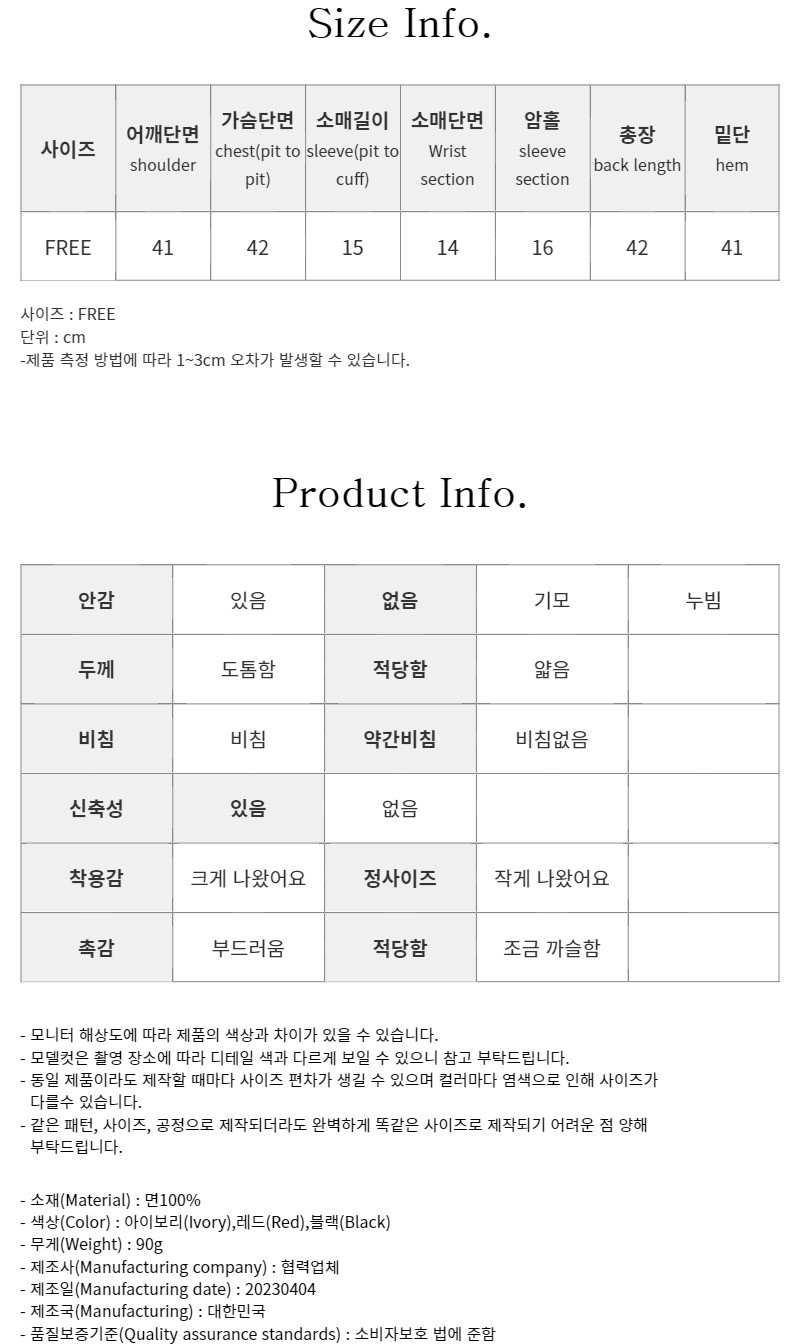 品名:하트크롭 ◎※☞颜色:레드, 블랙, 아이보리 ◎※☞尺寸:FREE ◎※☞材质:纯棉 100% ◎※☞注意事项:只能干洗,只能手洗,不能手洗,机洗,不能使用漂白剂,不能烘干,不能熨烫,不能曲折 翻译