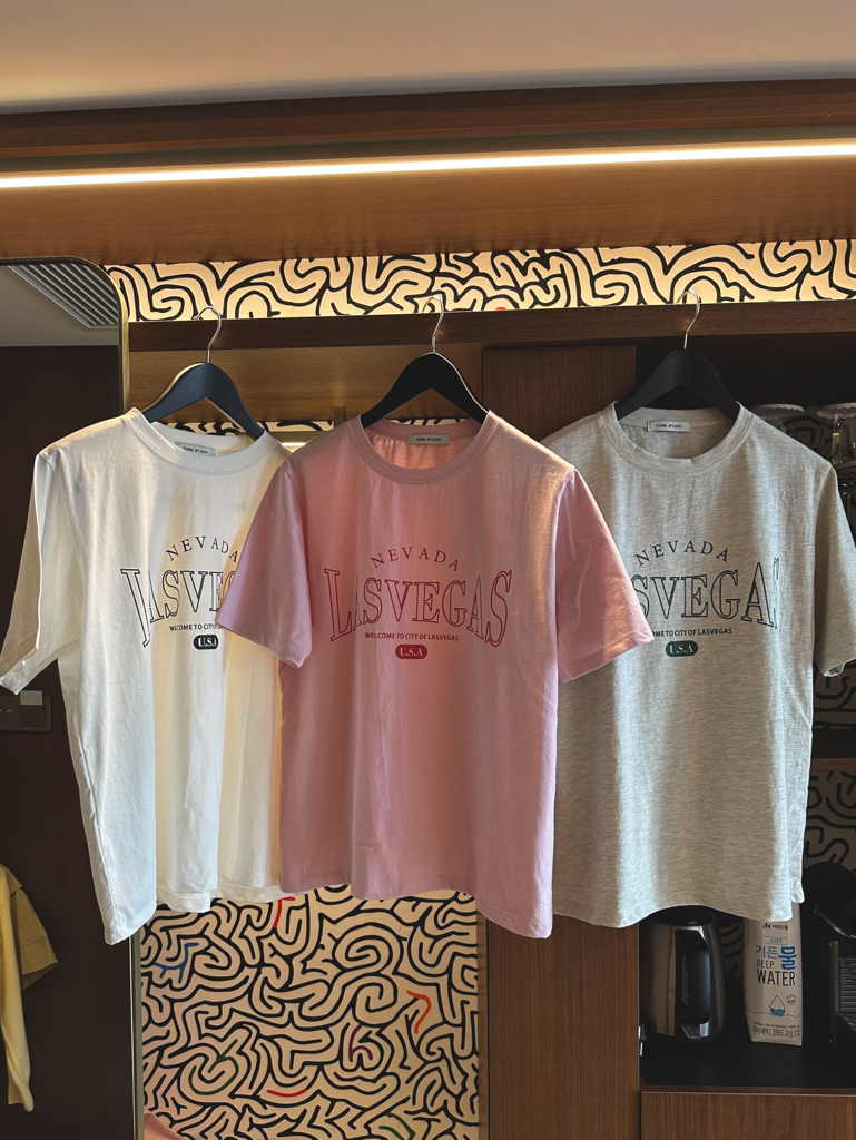 品名:라스베가스T ◎※☞颜色:아이, 오트베이지, 핑크 ◎※☞尺寸:FREE ◎※☞材质:纯棉 100% ◎※☞注意事项:只能干洗,只能手洗,不能手洗,机洗,不能使用漂白剂,不能烘干,不能熨烫,不能曲折 翻译