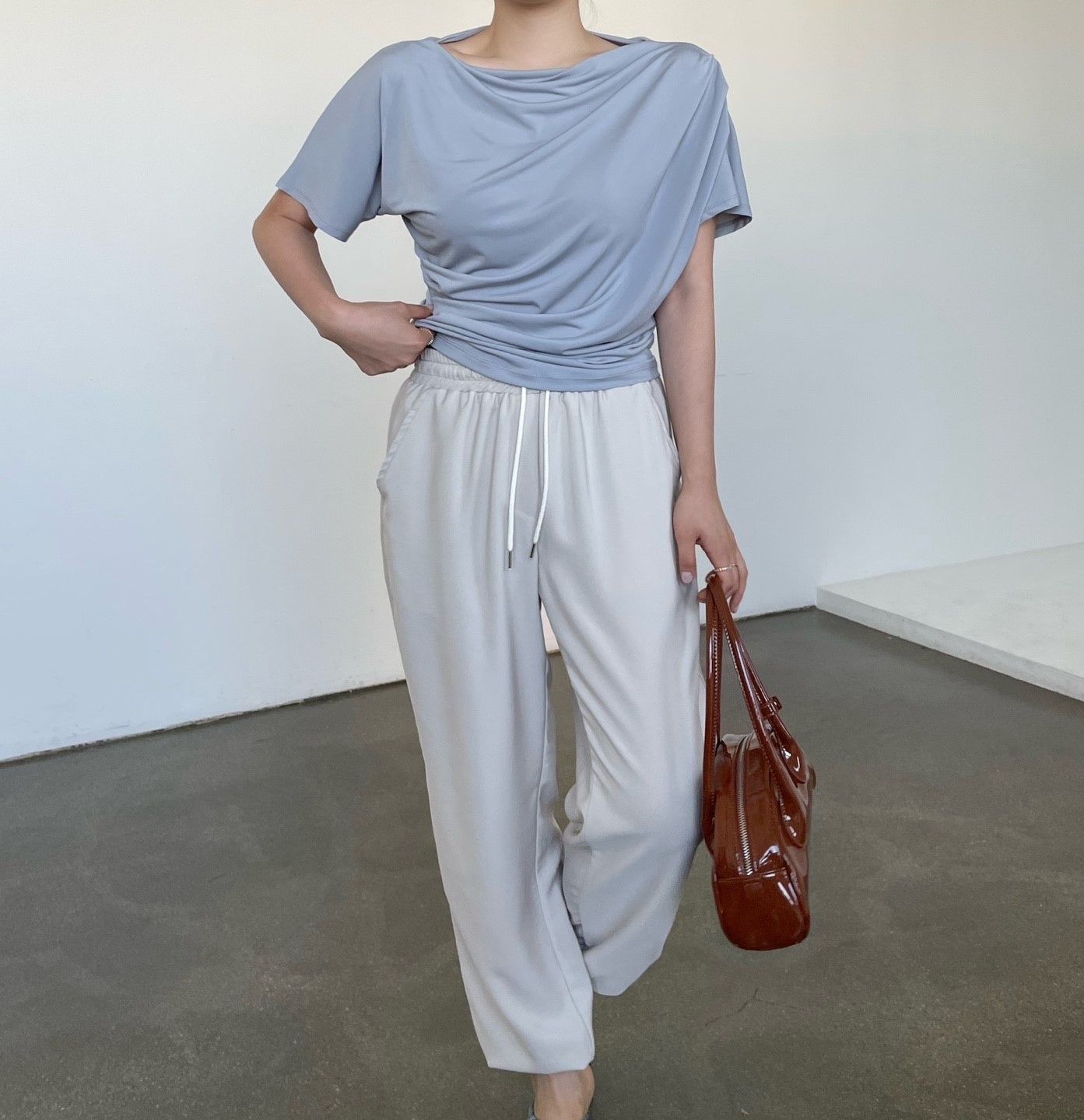品名:오프 셔링 드레이프 티셔츠T ◎※☞颜色:베이지, 블랙, 소라, 아이보리 ◎※☞尺寸:FREE ◎※☞材质:스판 5%,聚酯 95% ◎※☞注意事项:只能干洗,只能手洗,不能手洗,机洗,不能使用漂白剂,不能烘干,不能熨烫,不能曲折