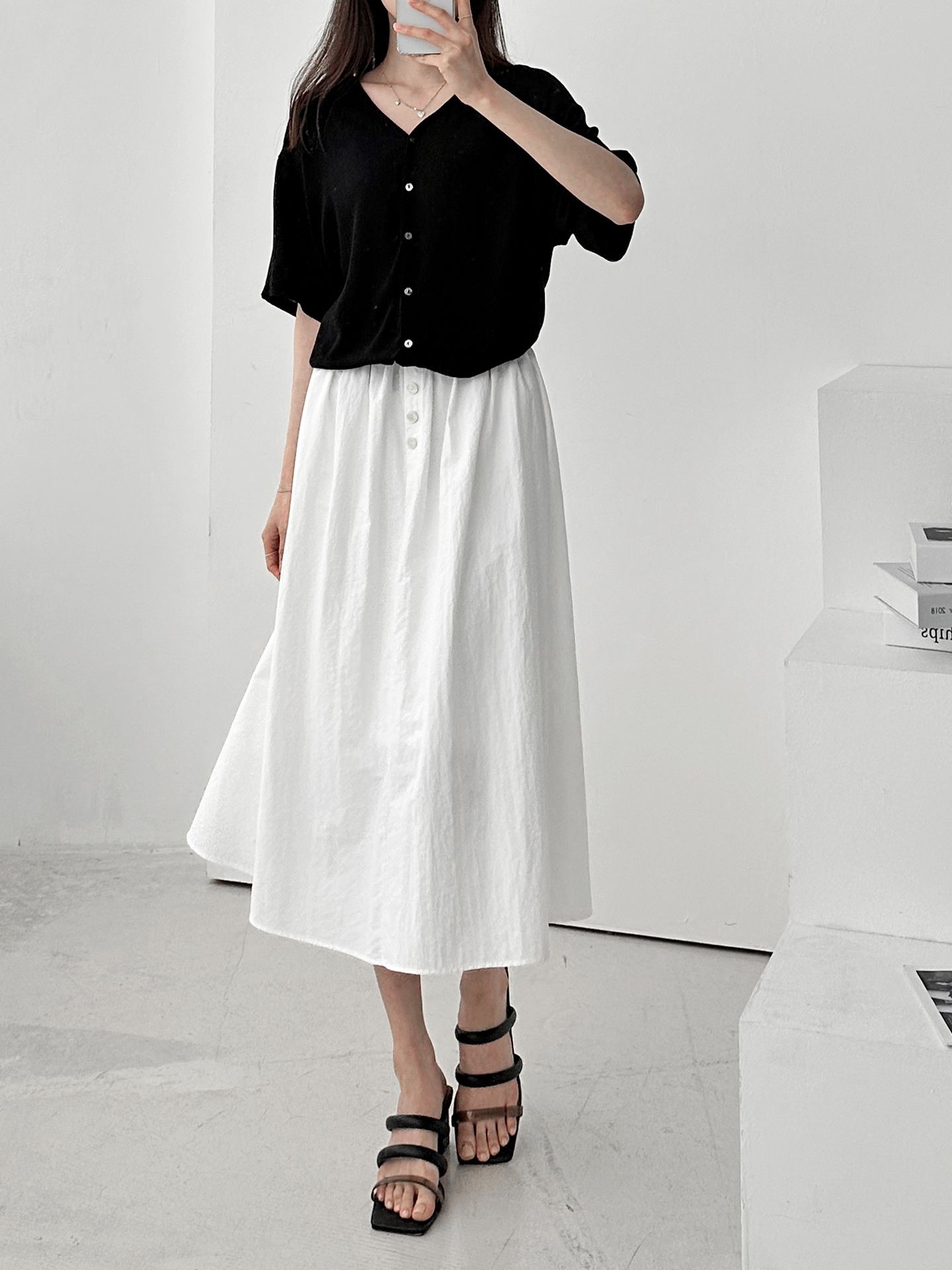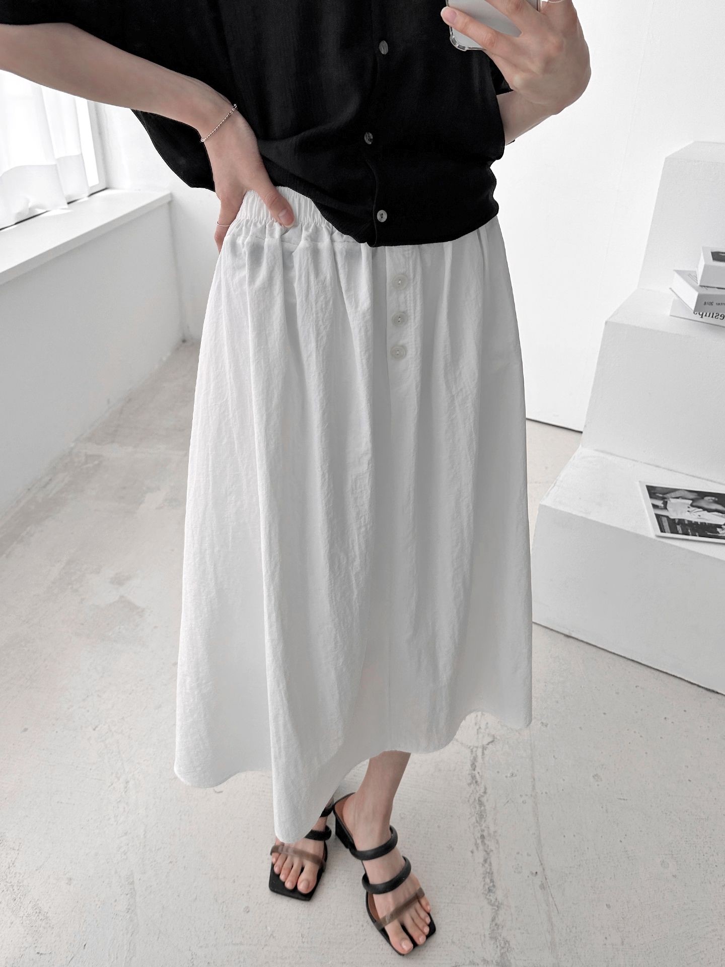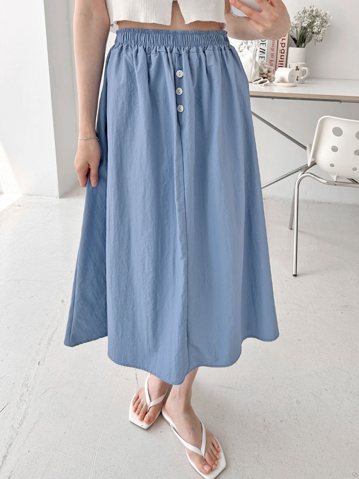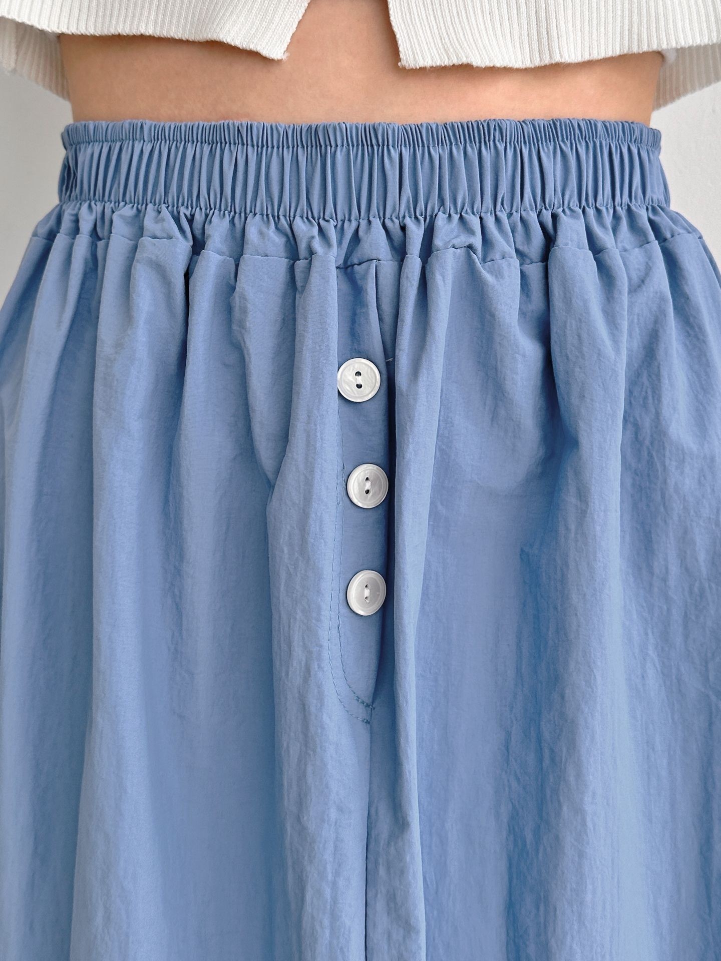 品名:버튼즈 밴딩 스커트 ◎※☞颜色:블랙, 블루, 화이트 ◎※☞尺寸:FREE ◎※☞材质:聚酯 100% ◎※☞注意事项:只能干洗,只能手洗,不能手洗,机洗,不能使用漂白剂,不能烘干,不能熨烫,不能曲折 翻译