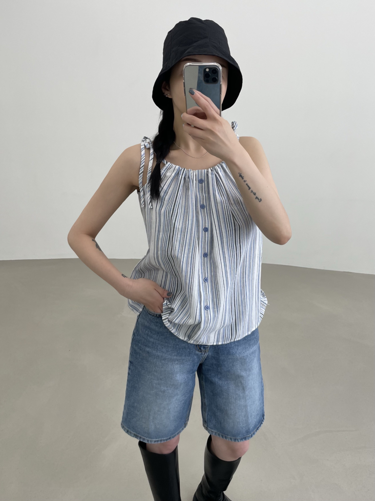 品名:홀터블라우스 ◎※☞颜色:베이지, 블루 ◎※☞尺寸:FREE ◎※☞材质:纯棉 100% 翻译