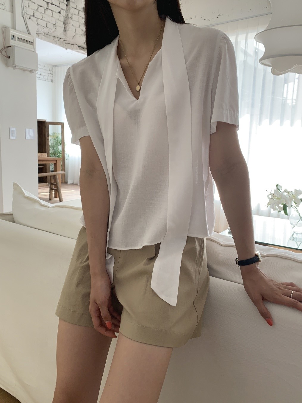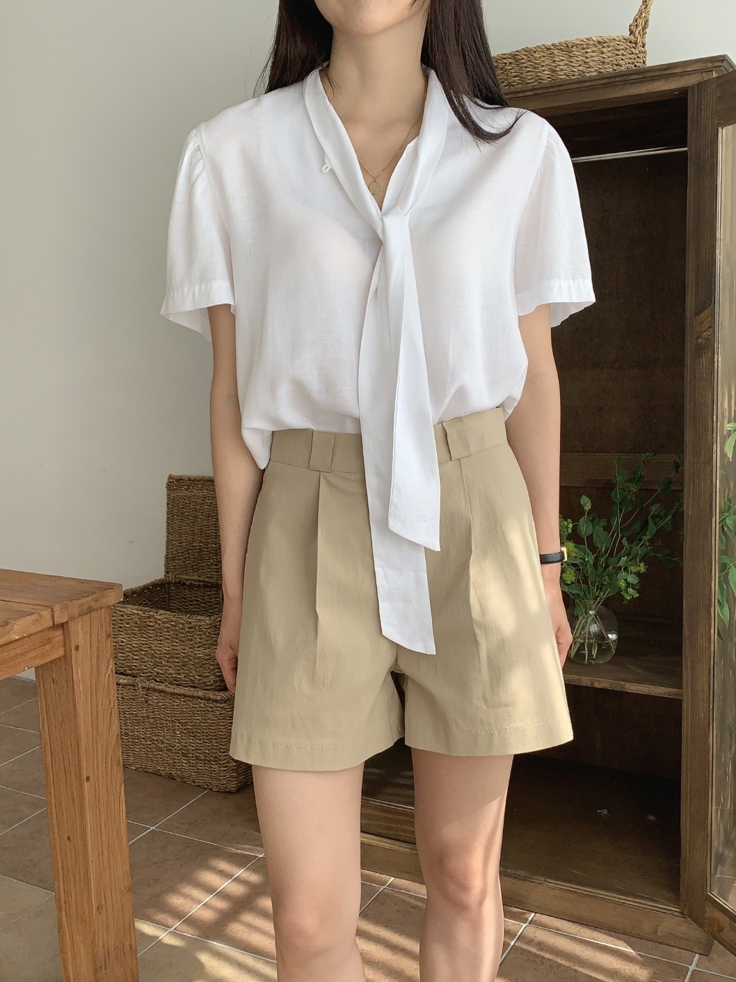 品名:린넨타이블라우스 ◎※☞颜色:블랙, 소라, 아이보리 ◎※☞尺寸:FREE ◎※☞材质:人造纤维 70%,亚麻 30% 翻译