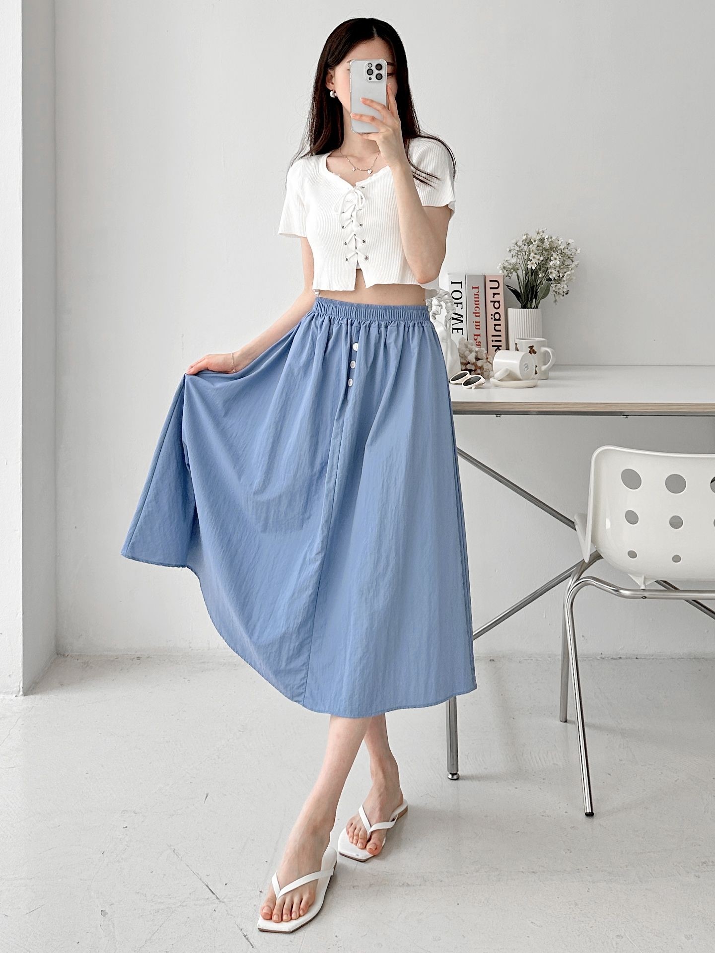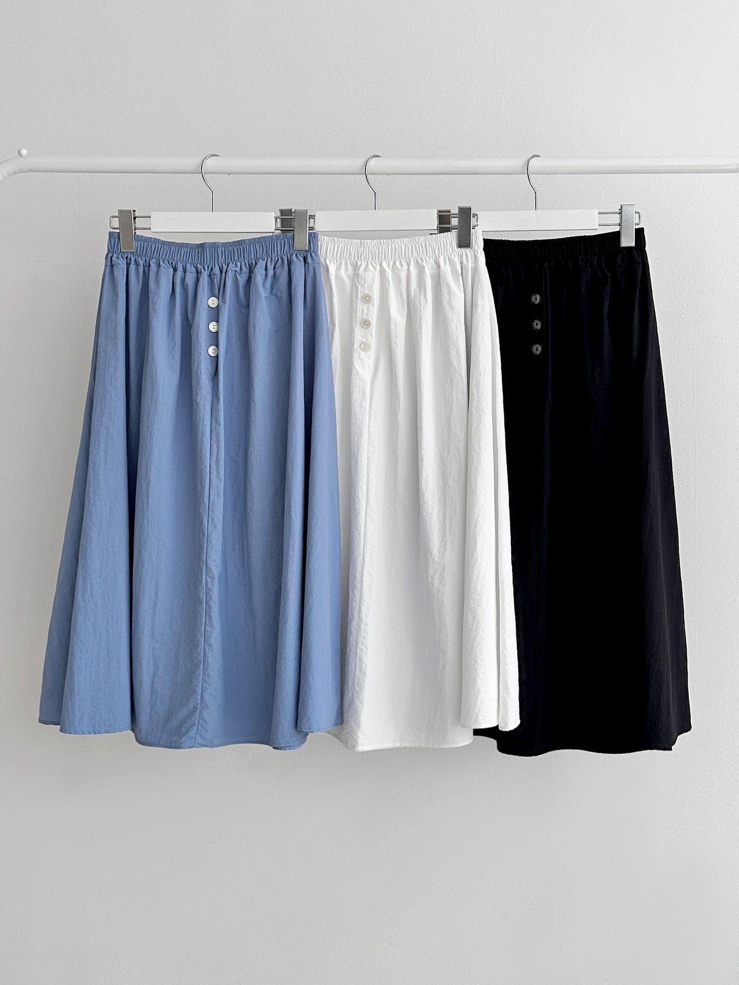 品名:버튼즈 밴딩 스커트 ◎※☞颜色:블랙, 블루, 화이트 ◎※☞尺寸:FREE ◎※☞材质:聚酯 100% ◎※☞注意事项:只能干洗,只能手洗,不能手洗,机洗,不能使用漂白剂,不能烘干,不能熨烫,不能曲折 翻译