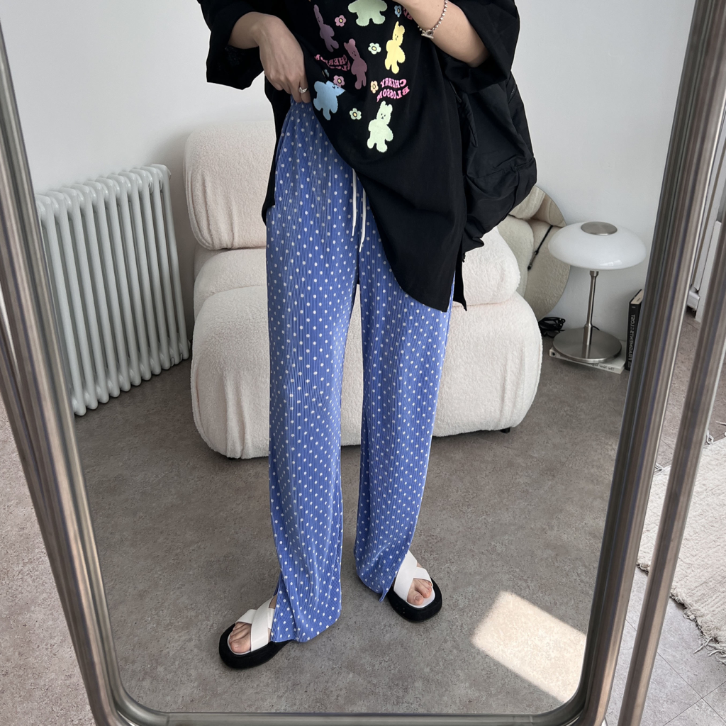 品名:도트 주름 밴딩 팬츠 플리츠 바지 ◎※☞颜色:검정, 소라, 초록 ◎※☞尺寸:FREE ◎※☞材质:聚酯 100% 翻译