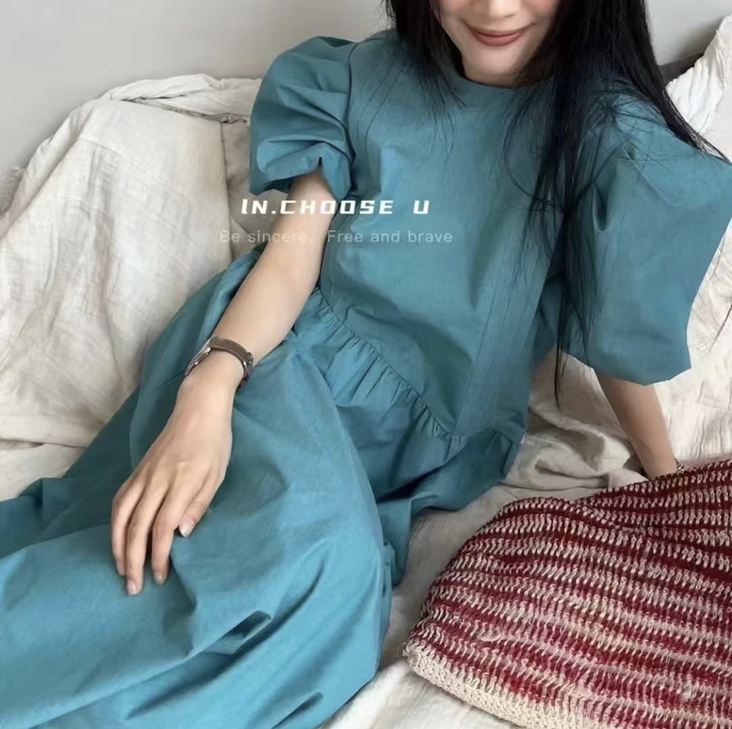 品名:6469 라인드 퍼프 원피스 ◎※☞颜色:블루, 화이트 ◎※☞尺寸:FREE ◎※☞材质:聚酯 100% 翻译