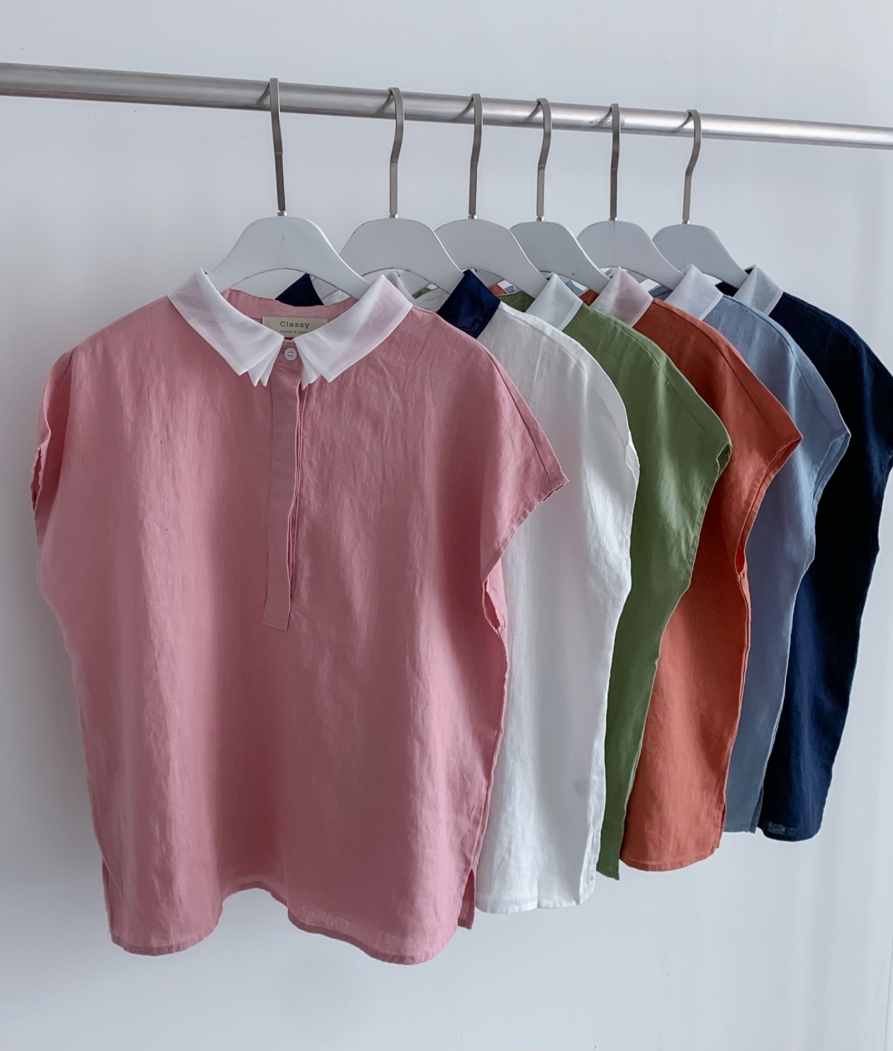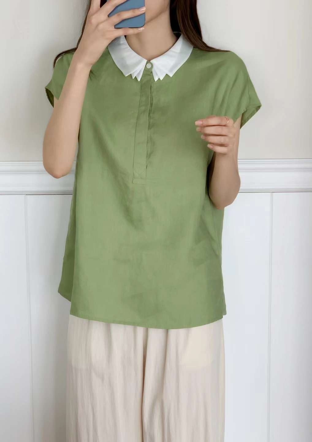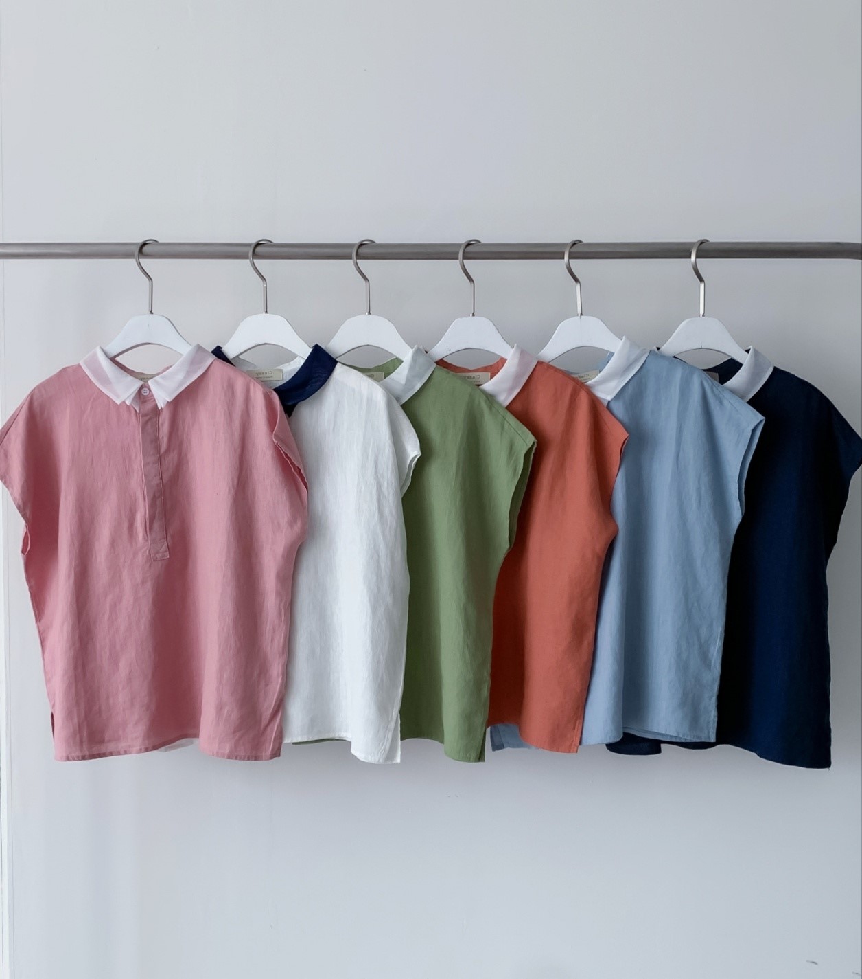品名:오간자카라 남방 ◎※☞颜色:네이비, 아이보리, 오렌지, 초록, 핑크, 하늘 ◎※☞尺寸:FREE ◎※☞材质:聚酯 70%,亚麻 30% 翻译