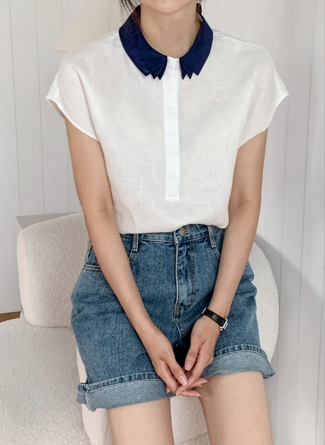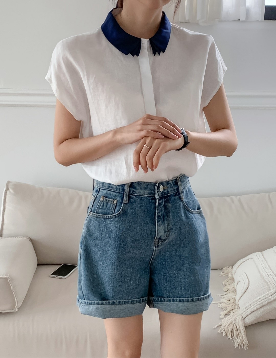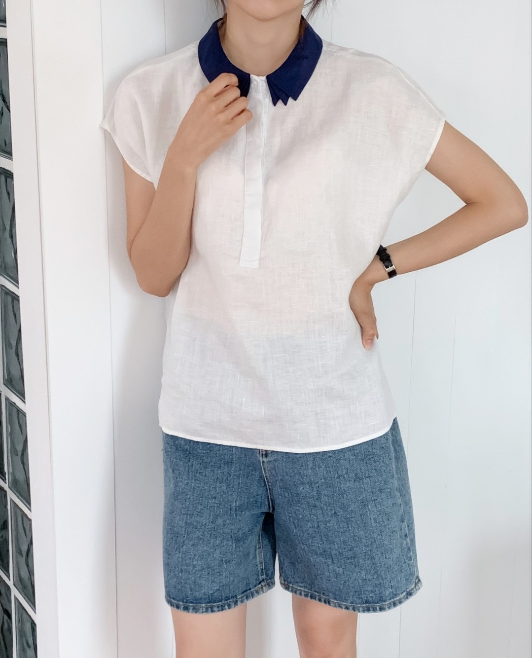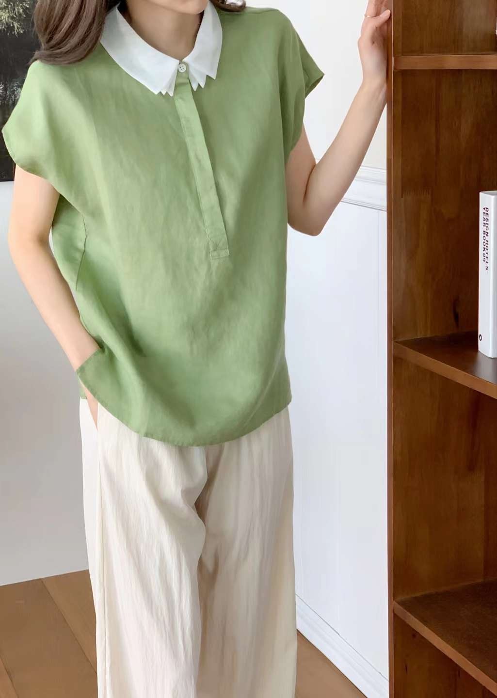 品名:오간자카라 남방 ◎※☞颜色:네이비, 아이보리, 오렌지, 초록, 핑크, 하늘 ◎※☞尺寸:FREE ◎※☞材质:聚酯 70%,亚麻 30% 翻译