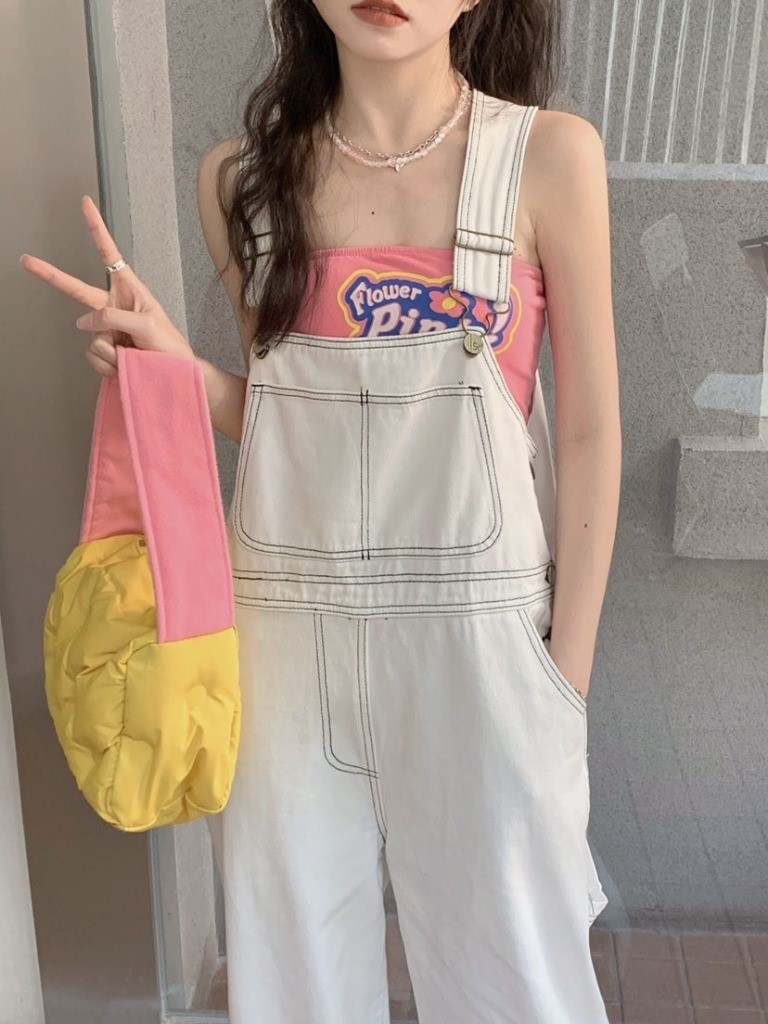 品名:스티치 멜빵 와이드 팬츠 ◎※☞颜色:화이트 ◎※☞尺寸:FREE ◎※☞材质:纯棉 100% 翻译