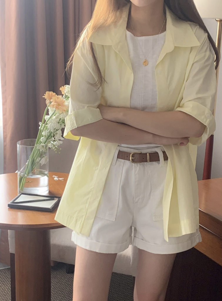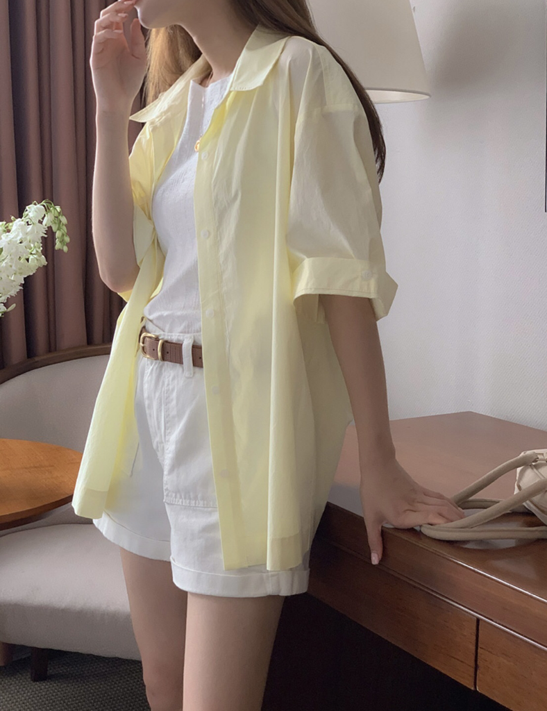 品名:커프스 롤업 반팔 셔츠 ◎※☞颜色:소라, 아이, 옐로우 ◎※☞尺寸:FREE ◎※☞材质:纯棉 100% 翻译