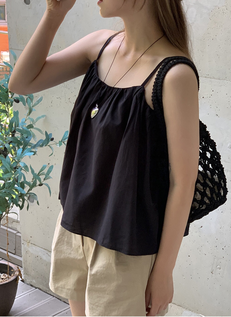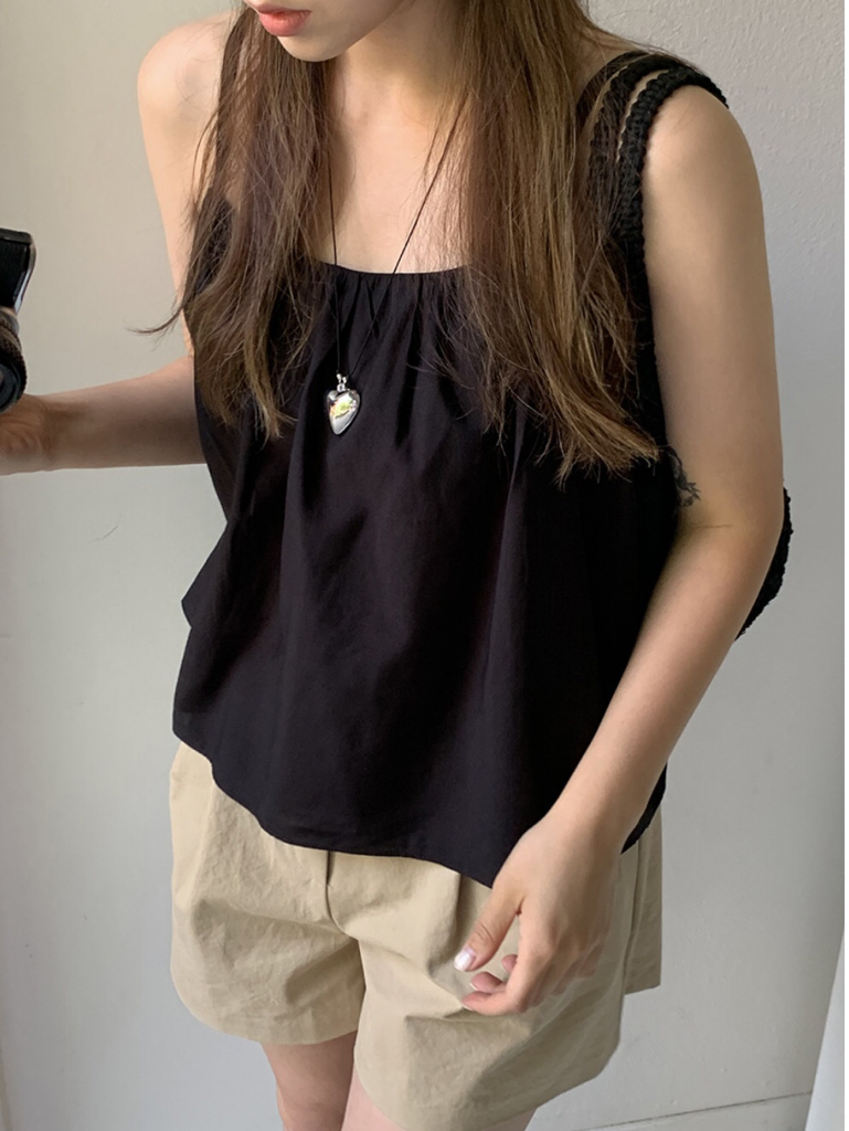 品名:셔링 끈나시 블라우스 (거래처사진) ◎※☞颜色:블랙, 크림 ◎※☞尺寸:FREE ◎※☞材质:人造纤维 92%,聚酯 8% 翻译