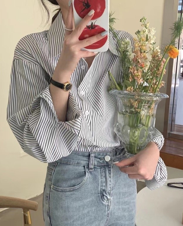品名:스트라이프 사선 베이직셔츠 ◎※☞颜色:블랙, 소라 ◎※☞尺寸:FREE ◎※☞材质:聚酯 85%,人造纤维 15%