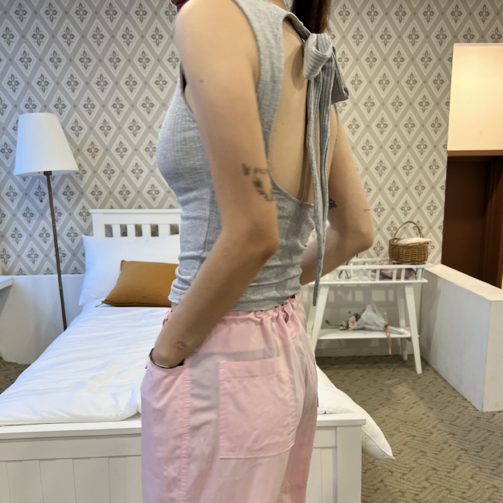 品名:빽매듭나시 ◎※☞颜色:검정, 그레이, 카키, 화이트 ◎※☞尺寸:FREE ◎※☞材质:聚酯 67%,人造纤维 28%,스판 5%