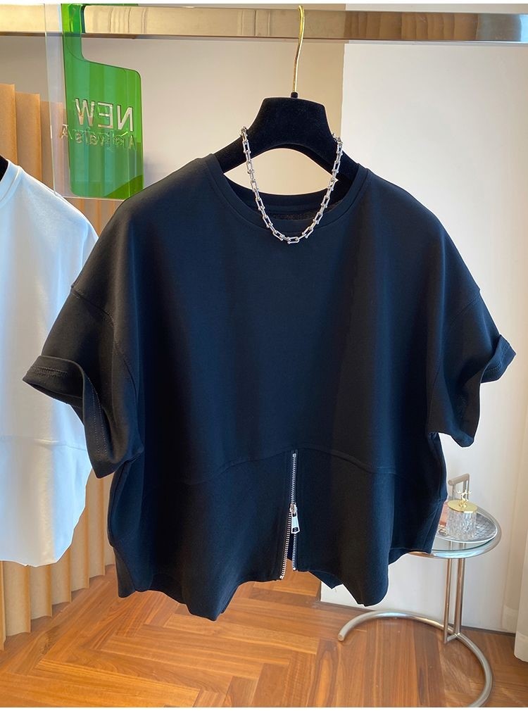 品名:지퍼 장식 반팔 티셔츠 ◎※☞颜色:블랙, 화이트 ◎※☞尺寸:FREE ◎※☞材质:聚氨酯 30%,纯棉 70% ◎※☞注意事项:只能干洗,只能手洗,不能手洗,机洗,不能使用漂白剂,不能烘干,不能熨烫,不能曲折