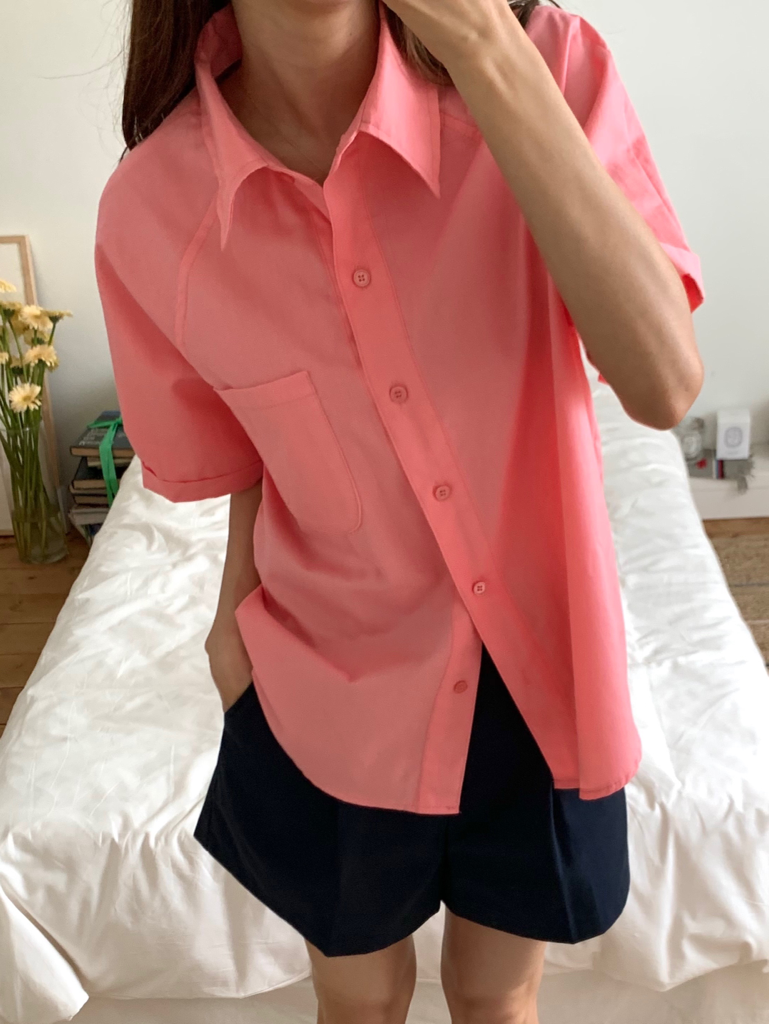 品名:코드셔츠#롤업셔츠#나그랑 ◎※☞颜色:네이비, 소라, 아이, 핑크 ◎※☞尺寸:FREE ◎※☞材质:纯棉 100%