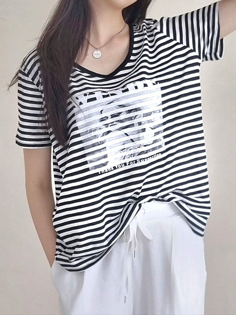 品名:X끈나염T(나염 백라인 크로스 끈 티셔츠) ◎※☞颜色:블랙, 스트라이프, 아이보리 ◎※☞尺寸:FREE ◎※☞材质:기타 100%