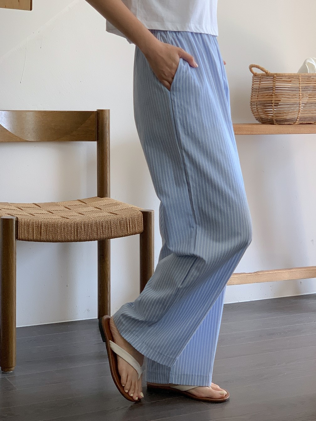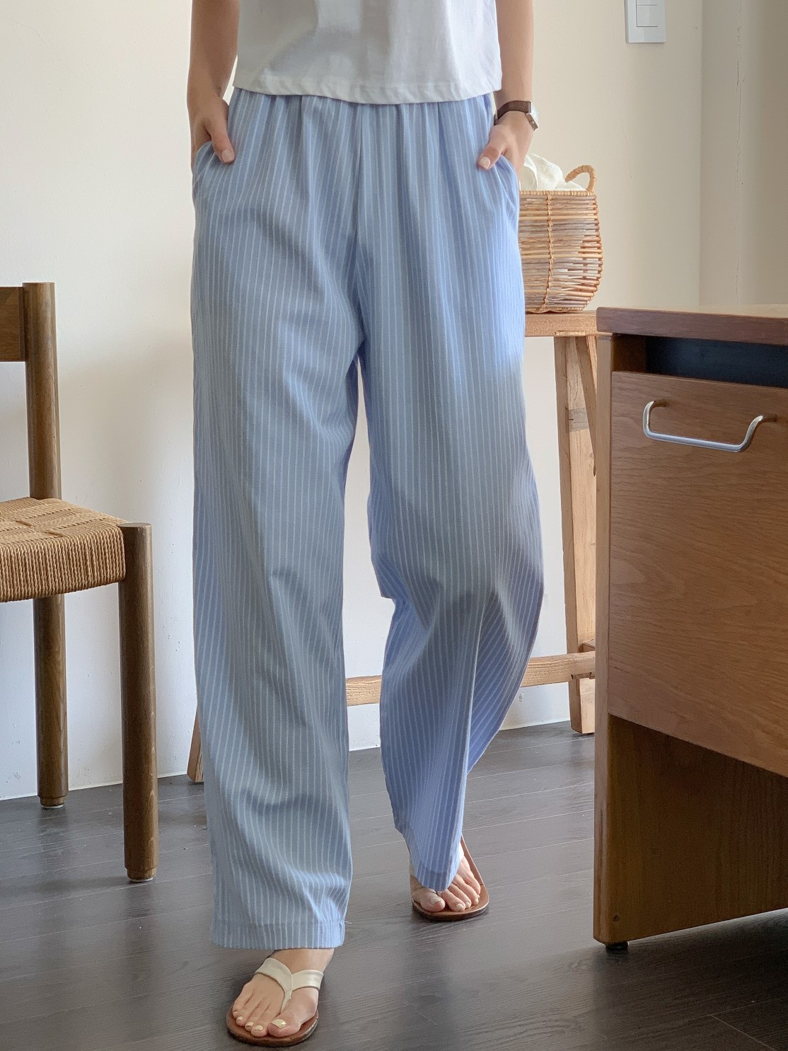品名:와이드쏠팬츠 55핏(스트라이프 와이드 통바지 줄지팬츠 허리밴딩 면소재) ◎※☞颜色:소라, 핑크 ◎※☞尺寸:FREE ◎※☞材质:纯棉 60%,聚酯 40% ◎※☞注意事项:只能干洗,只能手洗,不能手洗,机洗,不能使用漂白剂,不能烘干,不能熨烫,不能曲折