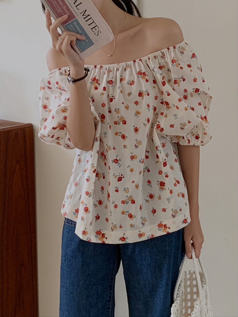 品名:도도플라워BL(셔링 오프솔더 블라우스) ◎※☞颜色:레드, 블루 ◎※☞尺寸:FREE ◎※☞材质:기타 100%