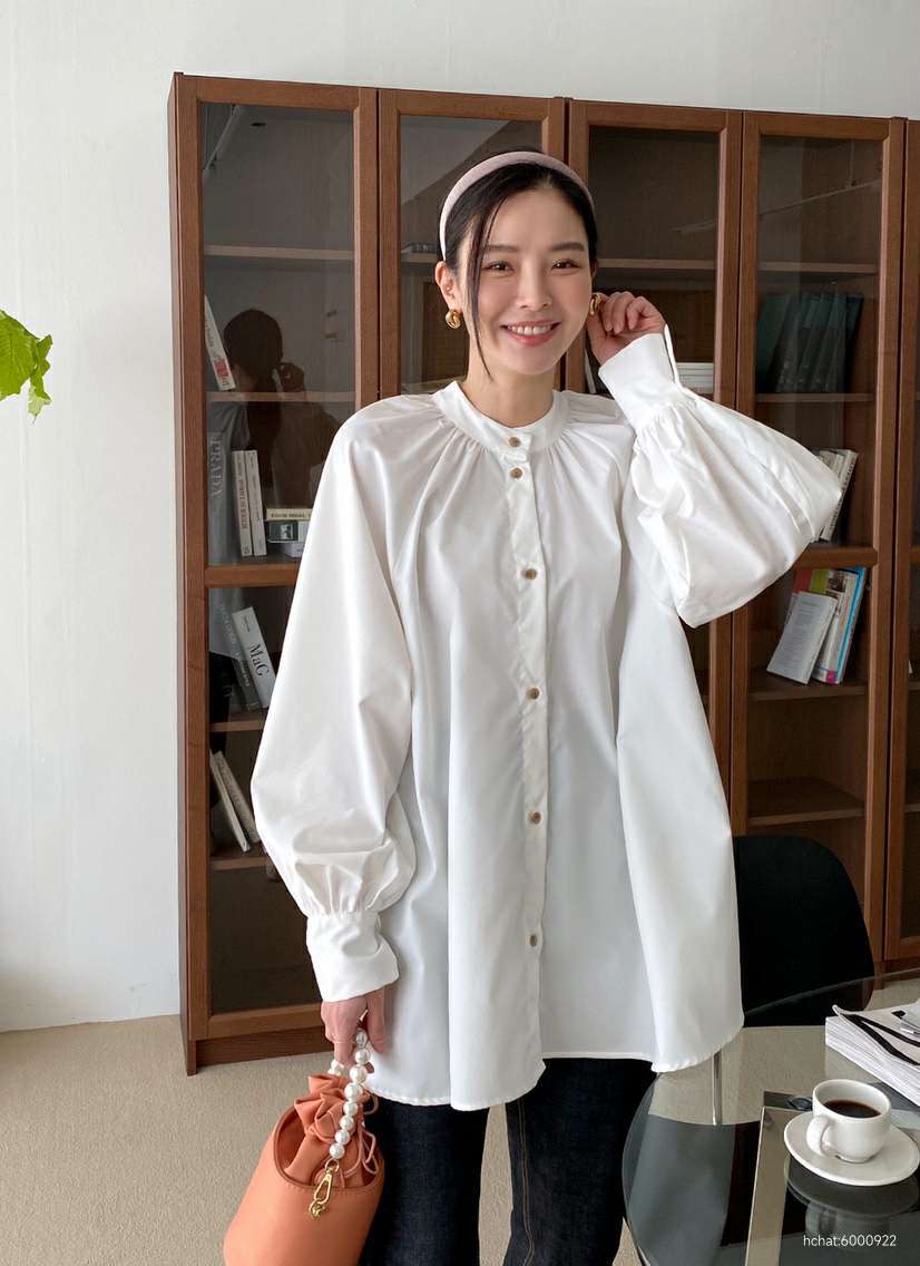A 핏의 풍성한 실루엣과 주름이 잡힌 스탠드 헨리넥 카라로 드롭숄더 벌룬 스타일의 래글런 소매로 고급스러운 소뿔 단추의 포인트를 주었으며 사이즈 구애없이 누구나 매치 가능한 아이템