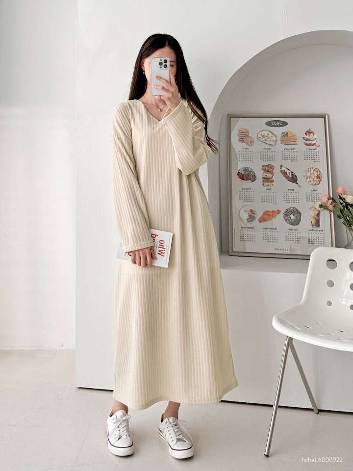 골지 니트 원단의 브이넥 원피스로 심플하게