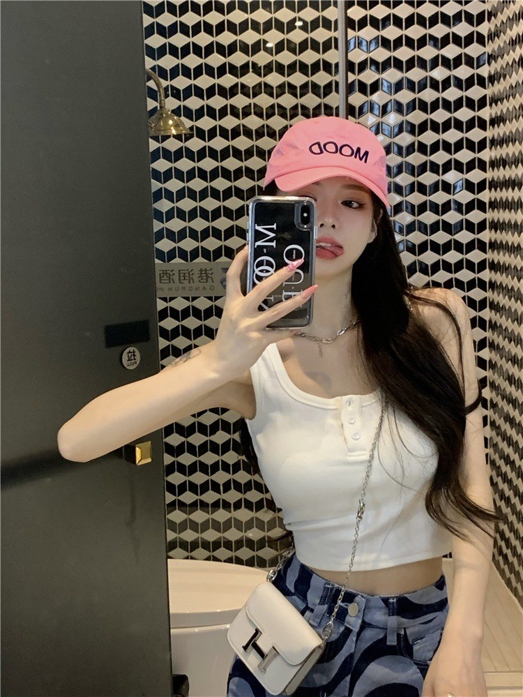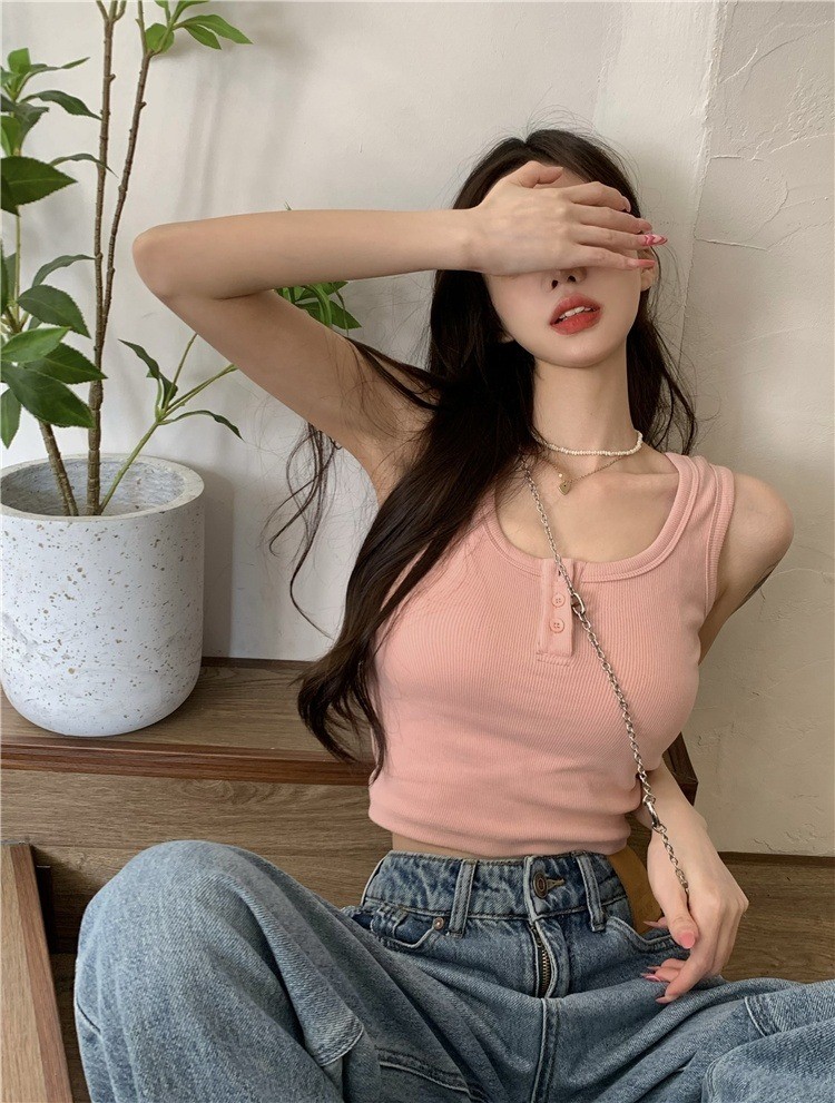 品名:베이직 딥 유넥 골지 버튼 크롭 나시 ◎※☞颜色:블랙, 핑크, 화이트 ◎※☞尺寸:FREE ◎※☞材质:纯棉 100%