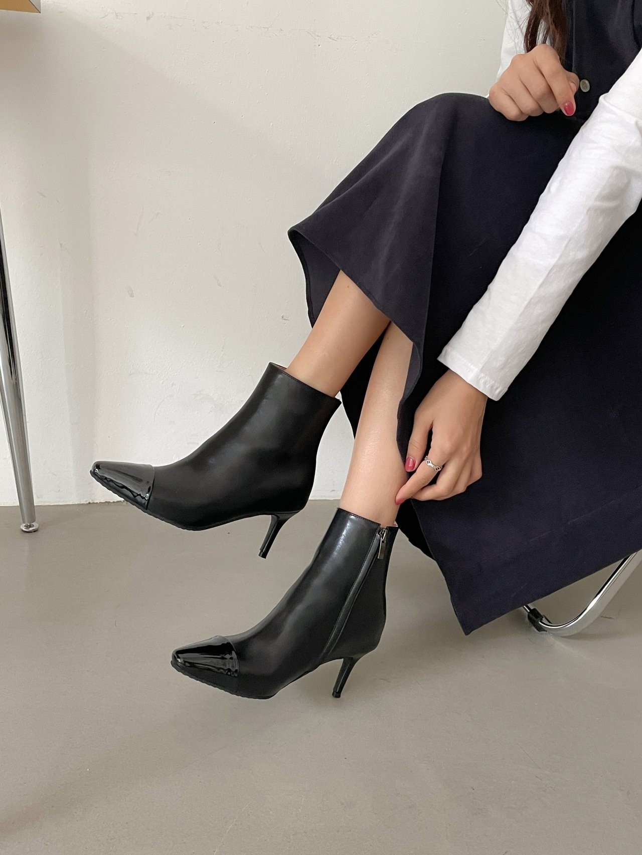 品名:RE 8447 소가죽 앞코 에나멜 배색 힐 앵클부츠 ◎※☞颜色:베이지, 블랙 ◎※☞尺寸:225, 230, 235, 240, 245, 250 ◎※☞材质:合成皮革 0%