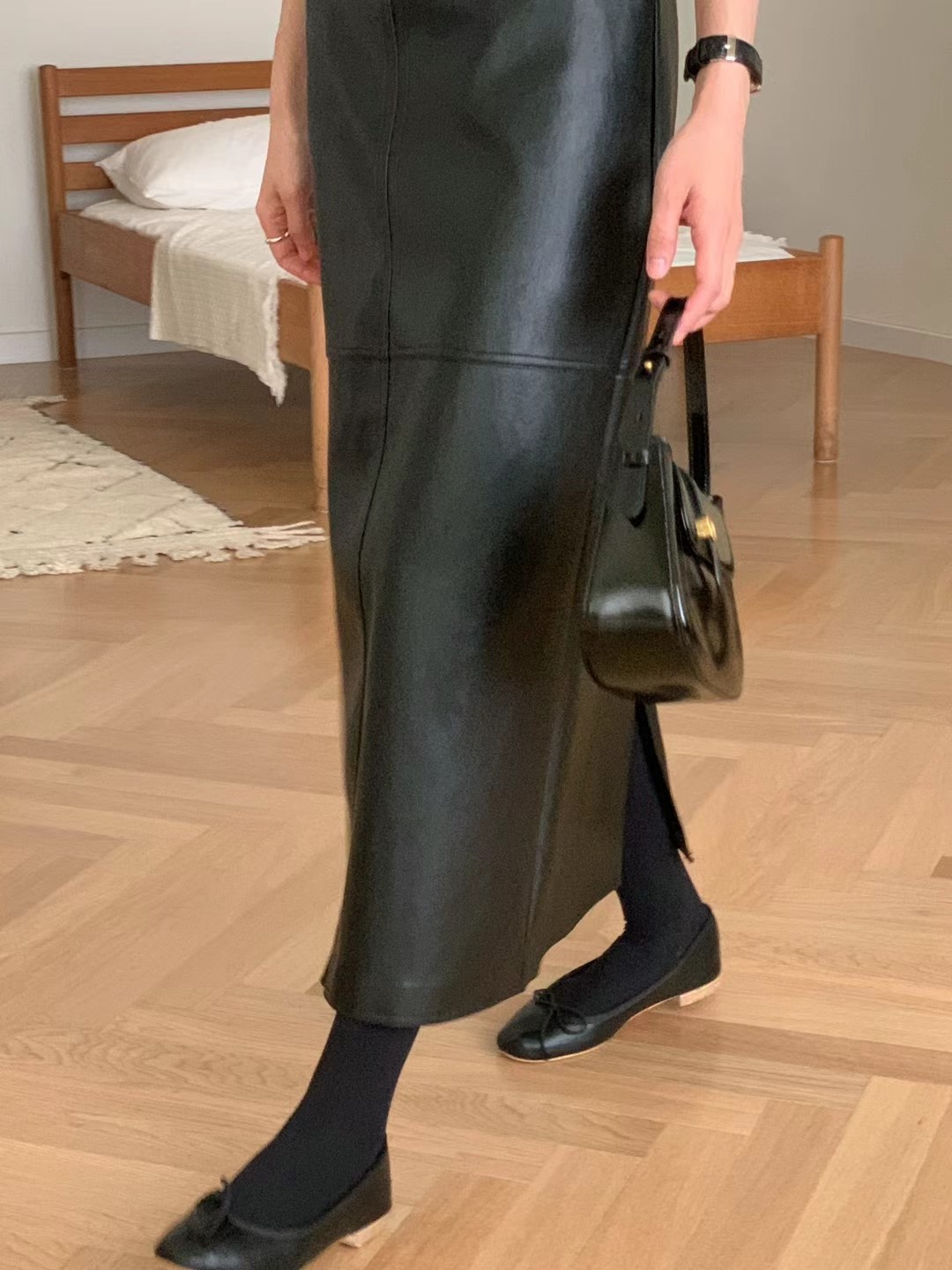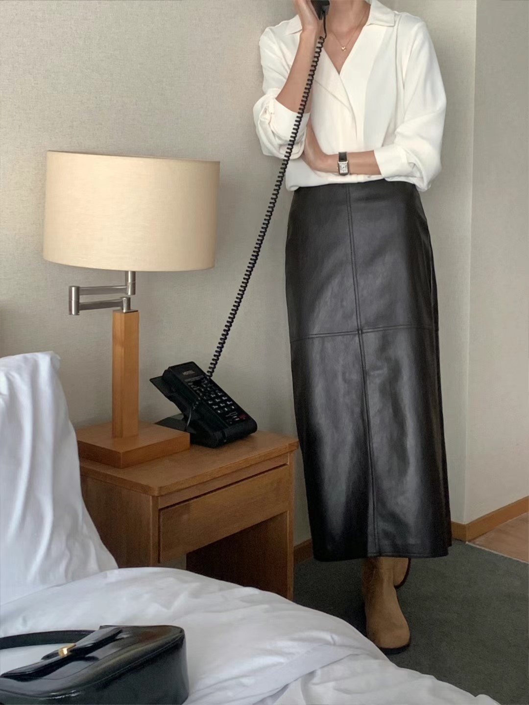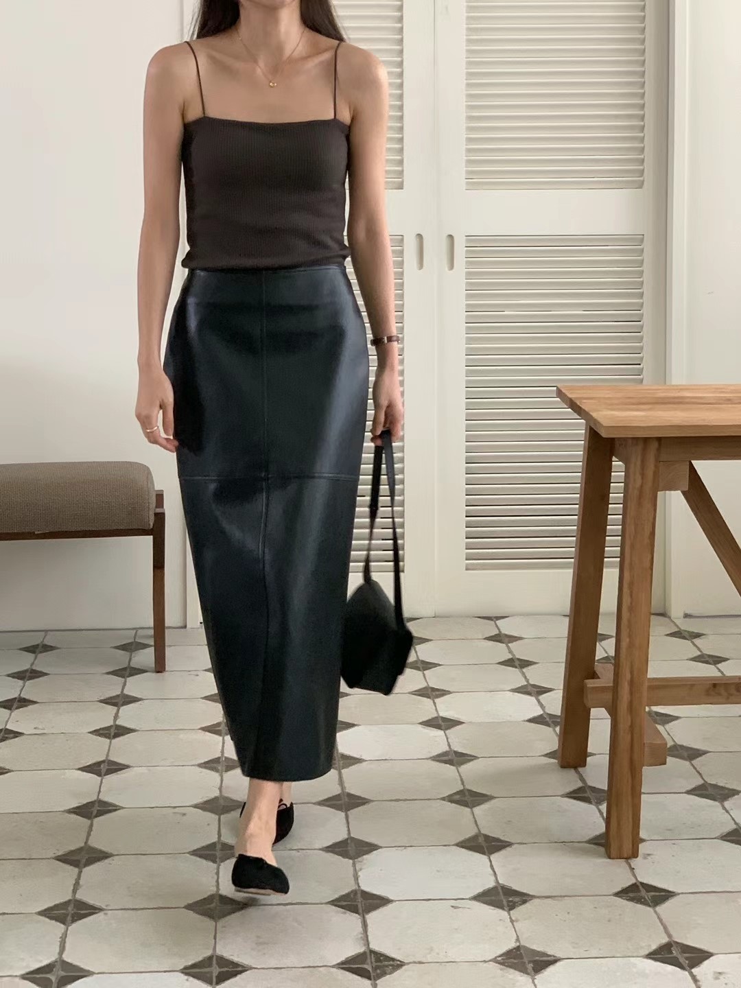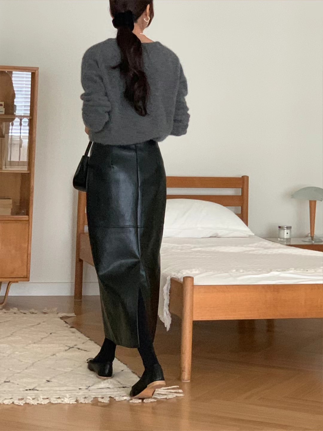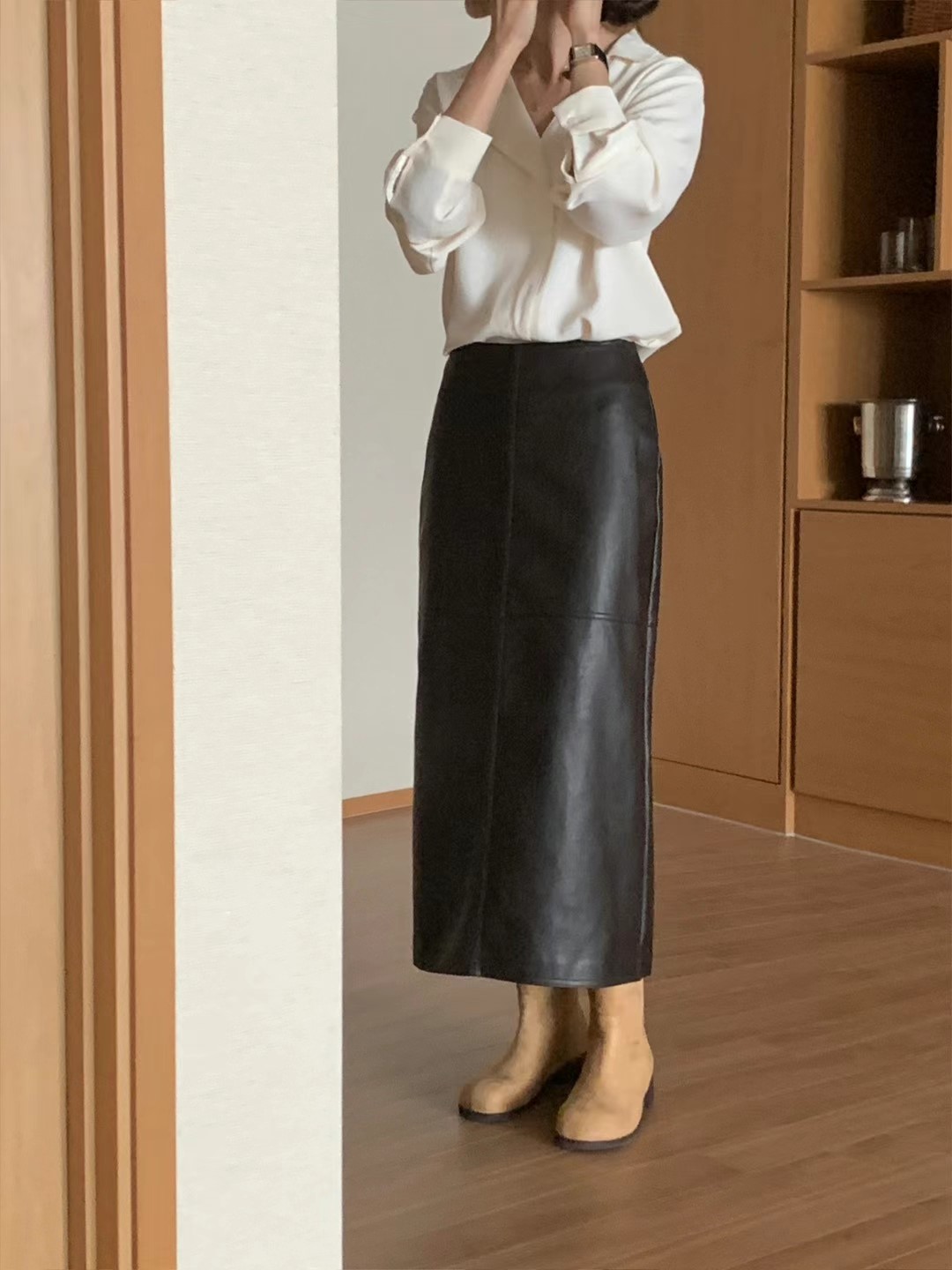 维根皮革材质,是h型裙子。细节不多,穿着不会有负担的很好的单品^^