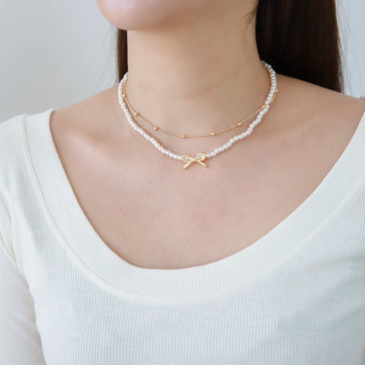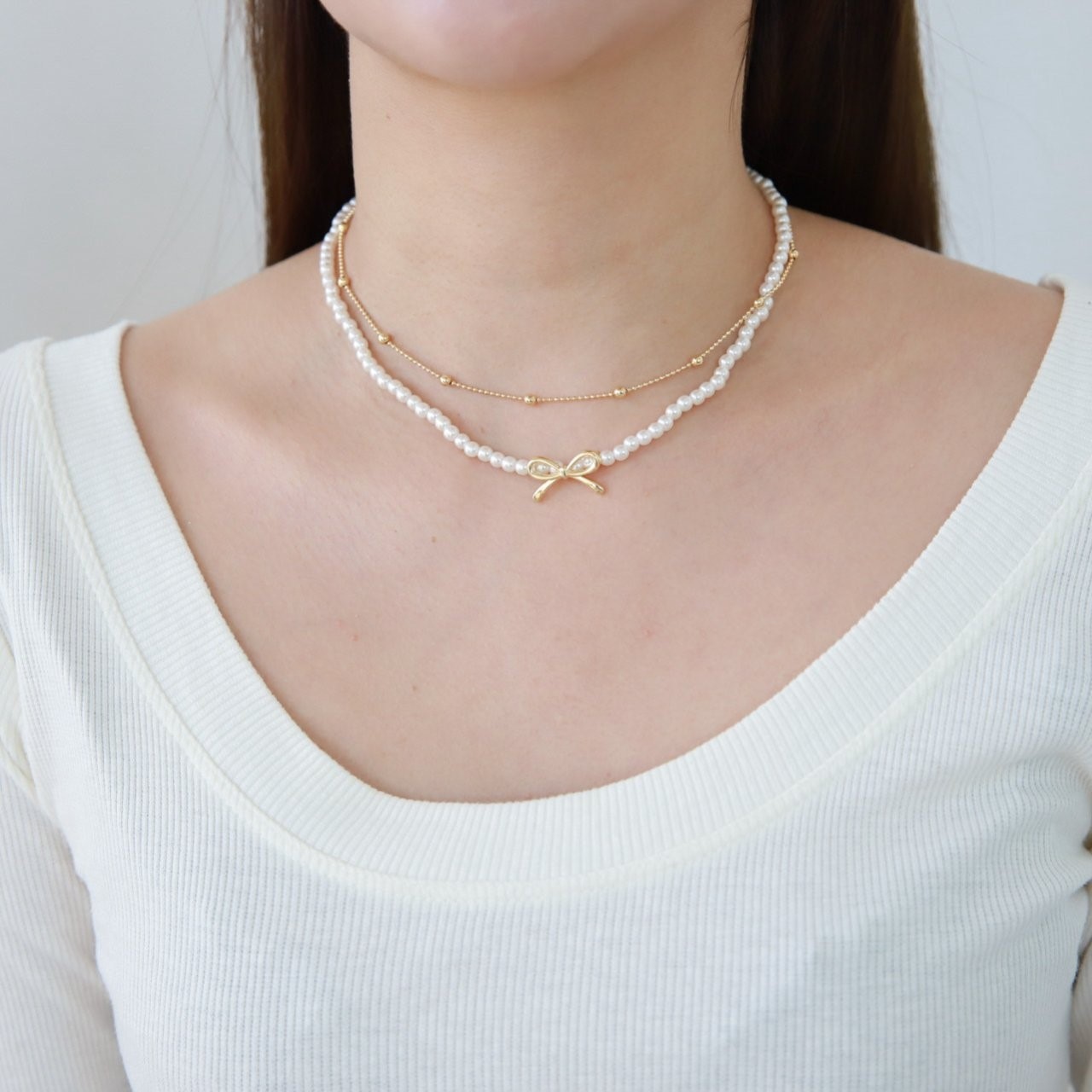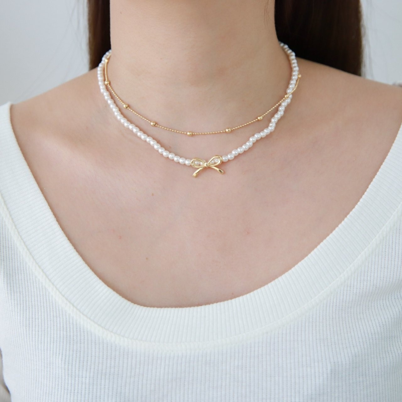 品名:N3315 모아 리본 진주 목걸이 세트 ◎※☞颜色:골드, 실버 ◎※☞尺寸:FREE ◎※☞材质:镀金 0%