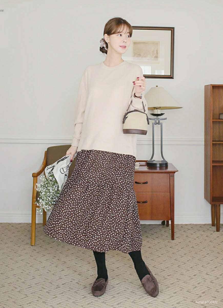 기모 골지 니트 맨투맨 스타일의 벌룬소매 상의와 ~ 피치 기모 원단의 심플하면서 포인트를 줄수있는 나염 무늬의 캉캉 스커트의 레이어드로 한벌로 편하고 가볍게 입을수 있는 원피스