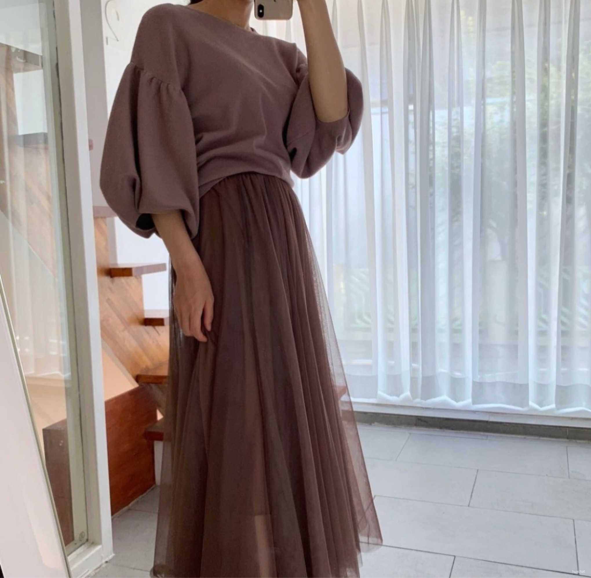 ; 두겹의 샤스커트에 넓게 훌지는 스커트로