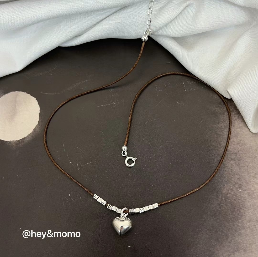 图款 ⚪️925 银 棕色小皮绳➕切割面银块 爱心吊坠 项链 11000