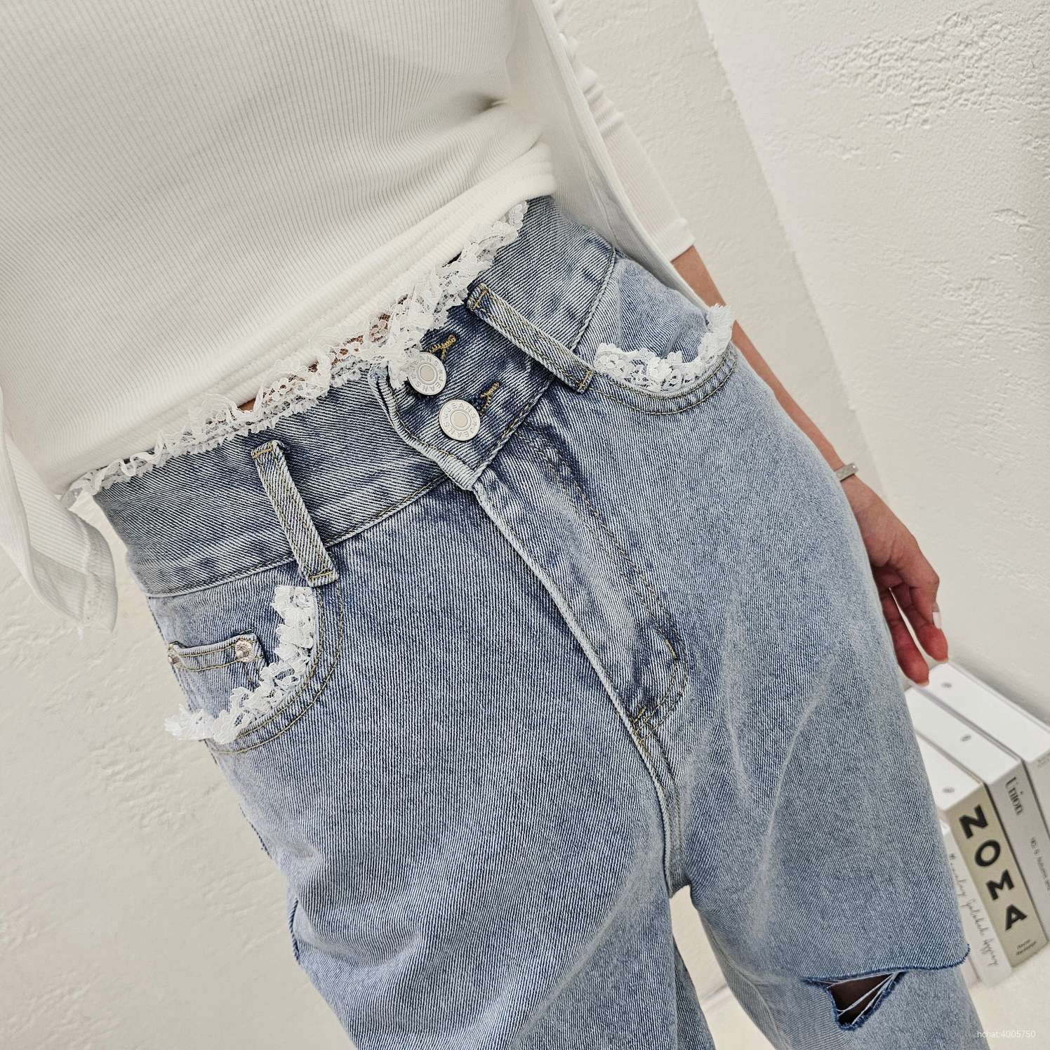 레이스투버튼일자데님팬츠