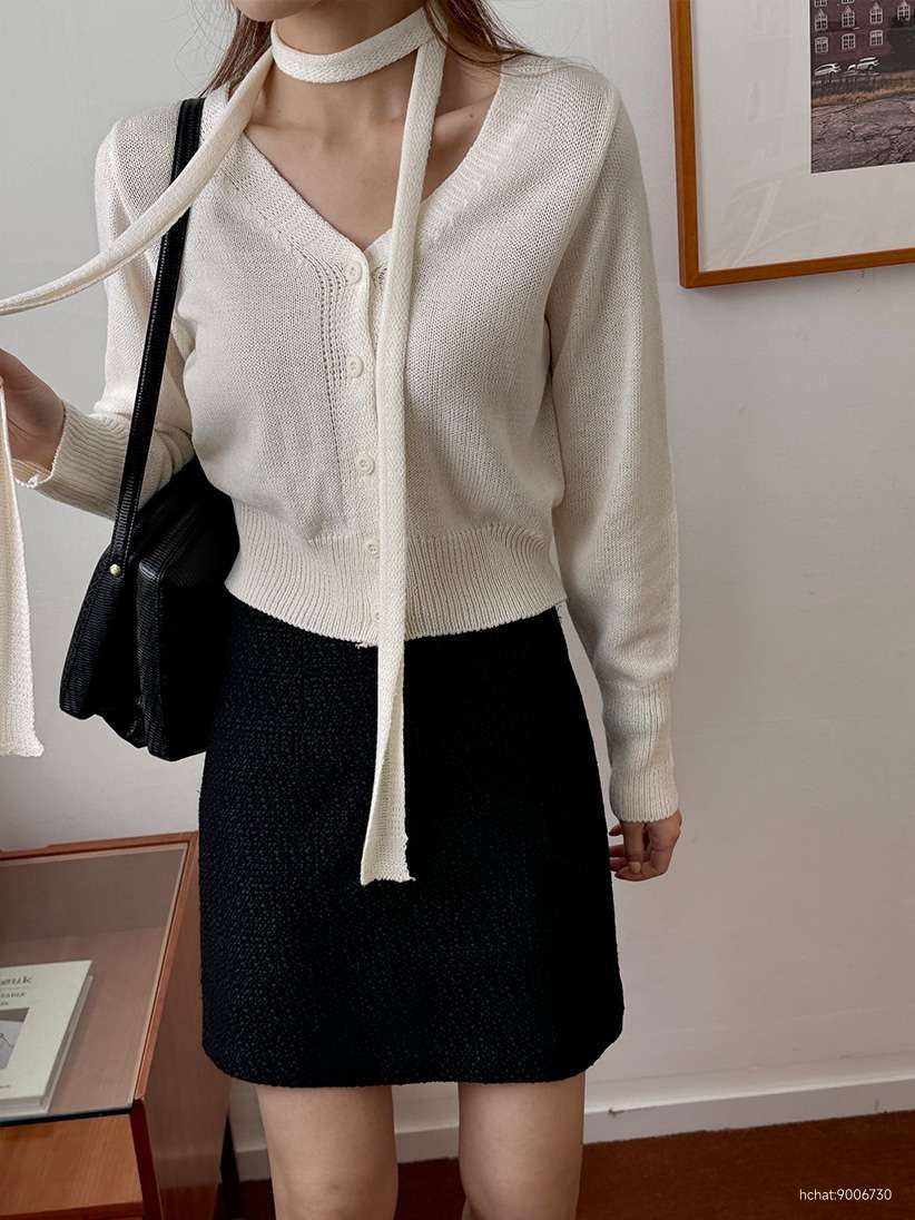 吊带围巾和V开衫一起进行的套装商品。
