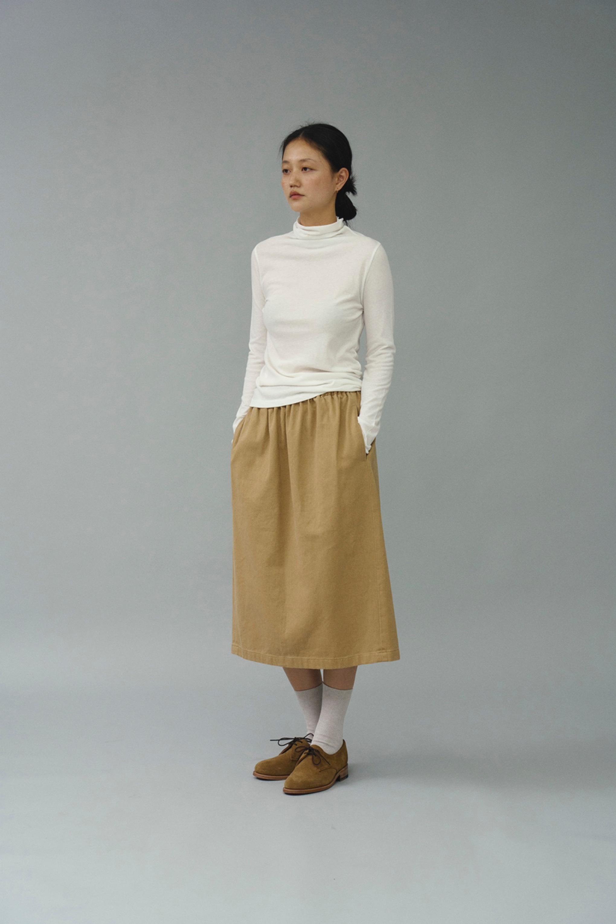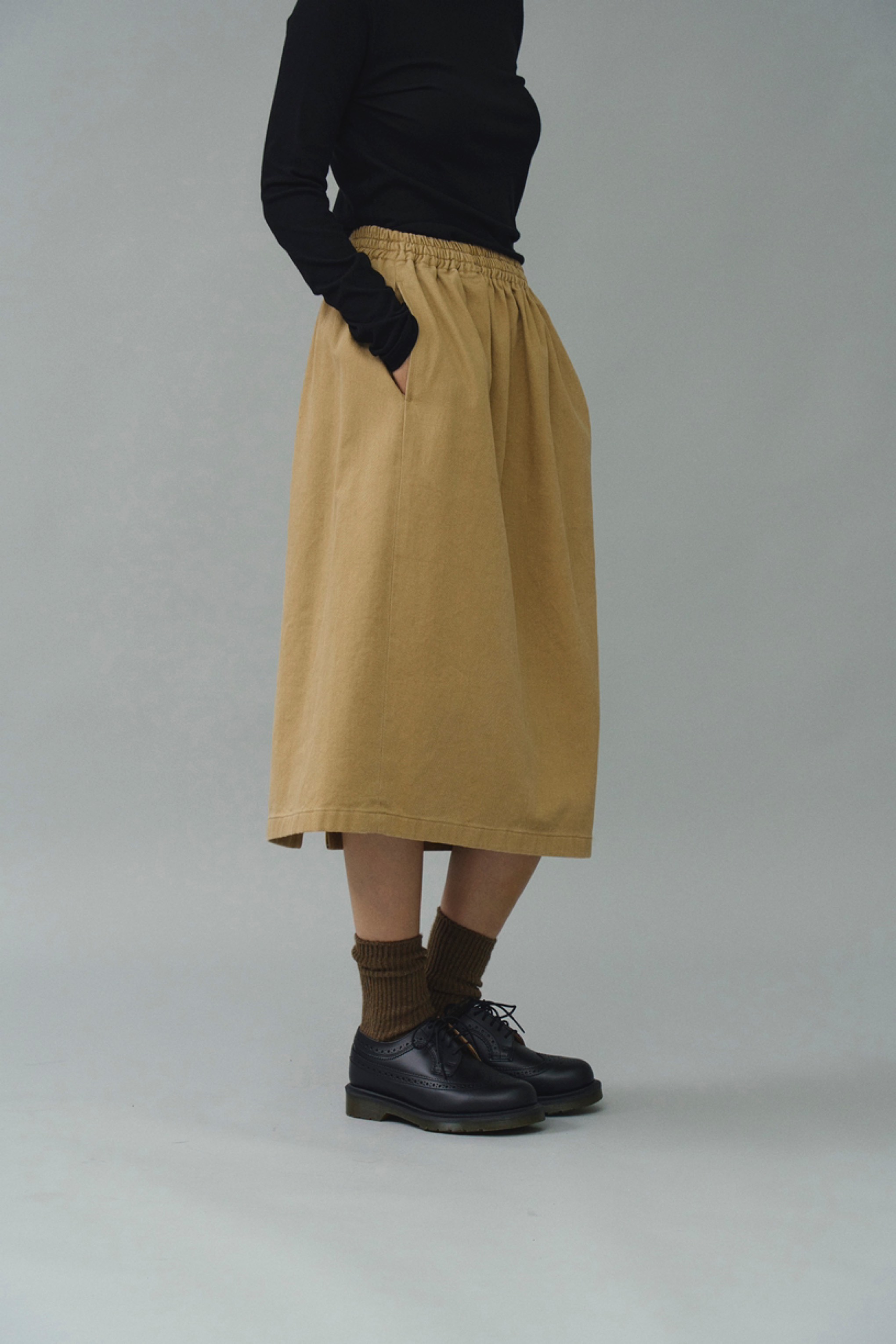 적당한 두께감의 코튼 100 원단을 사용하여 내구성이 좋고 착용감이 좋은 밴딩 스커트입니다.