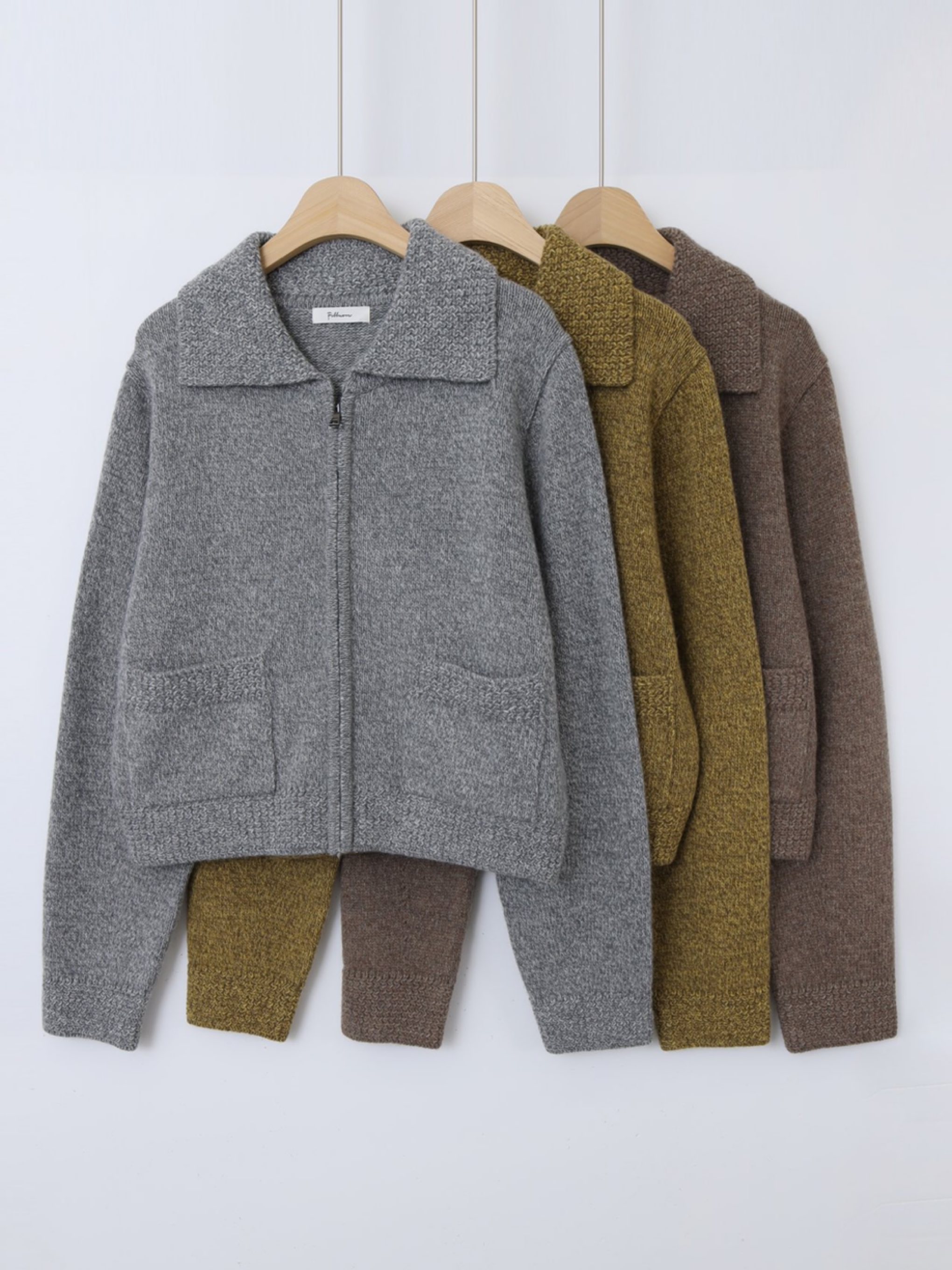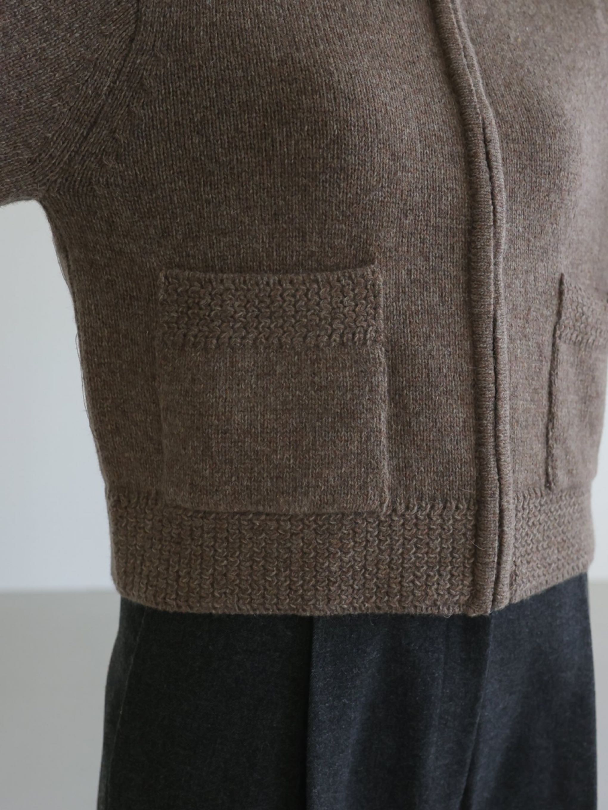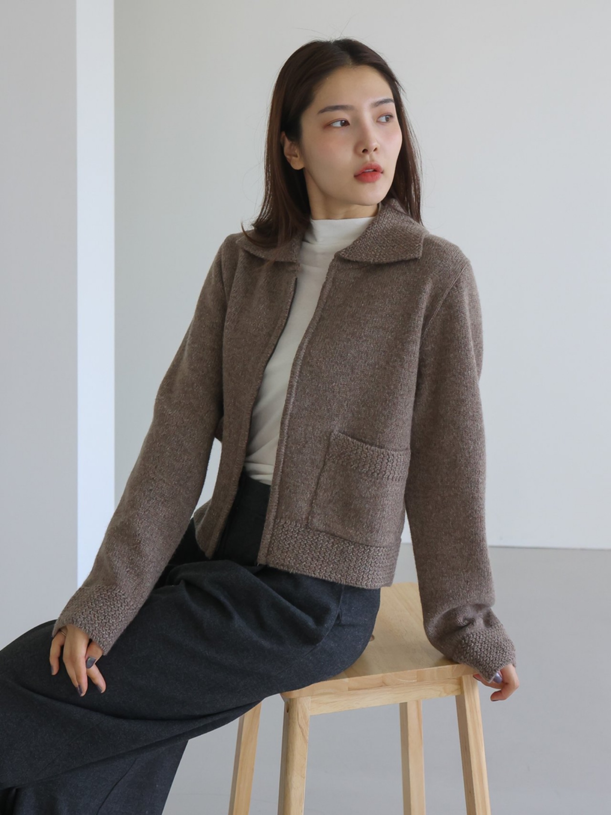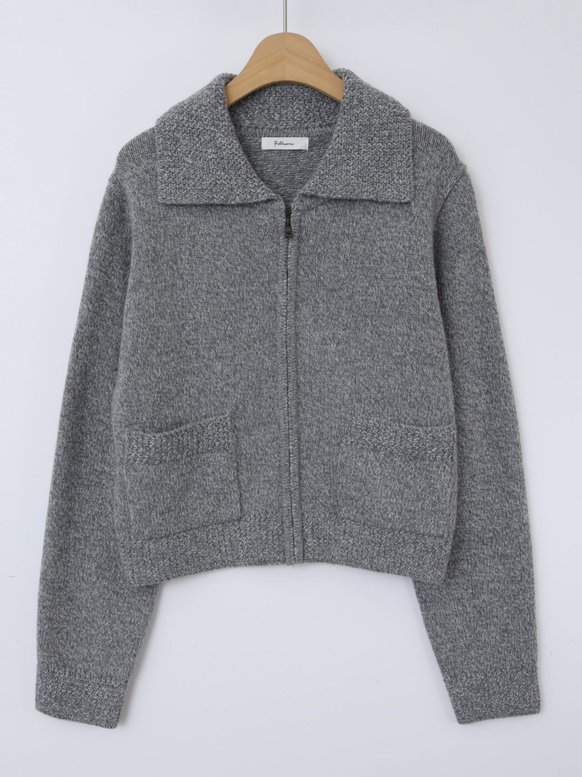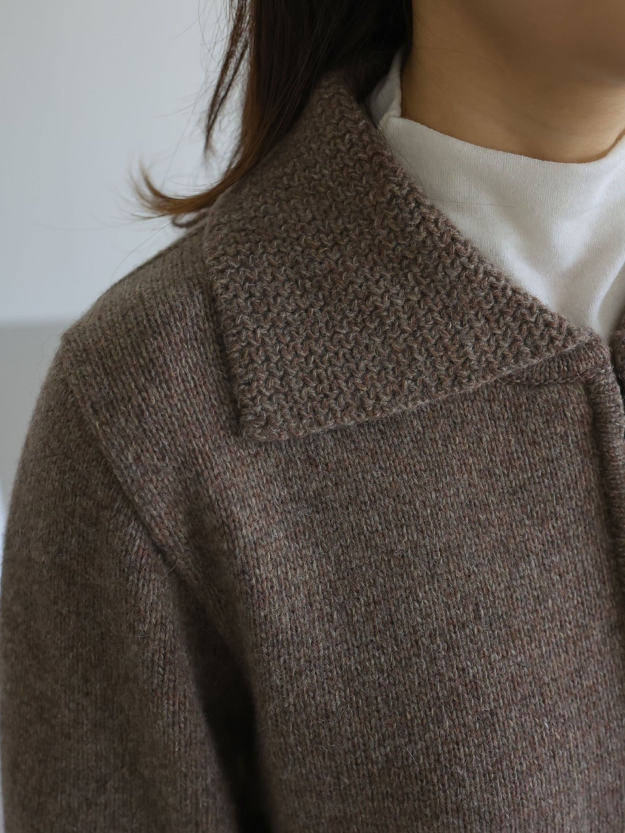"고급 울 원사를 사용하여 따뜻하고 부드러운 착용감을 선사합니다. 잔잔한 몸판 조직감과 변형 케이블 조직감이 대비되어 포인트가 되는 집업 형태의 카라 가디건입니다."
