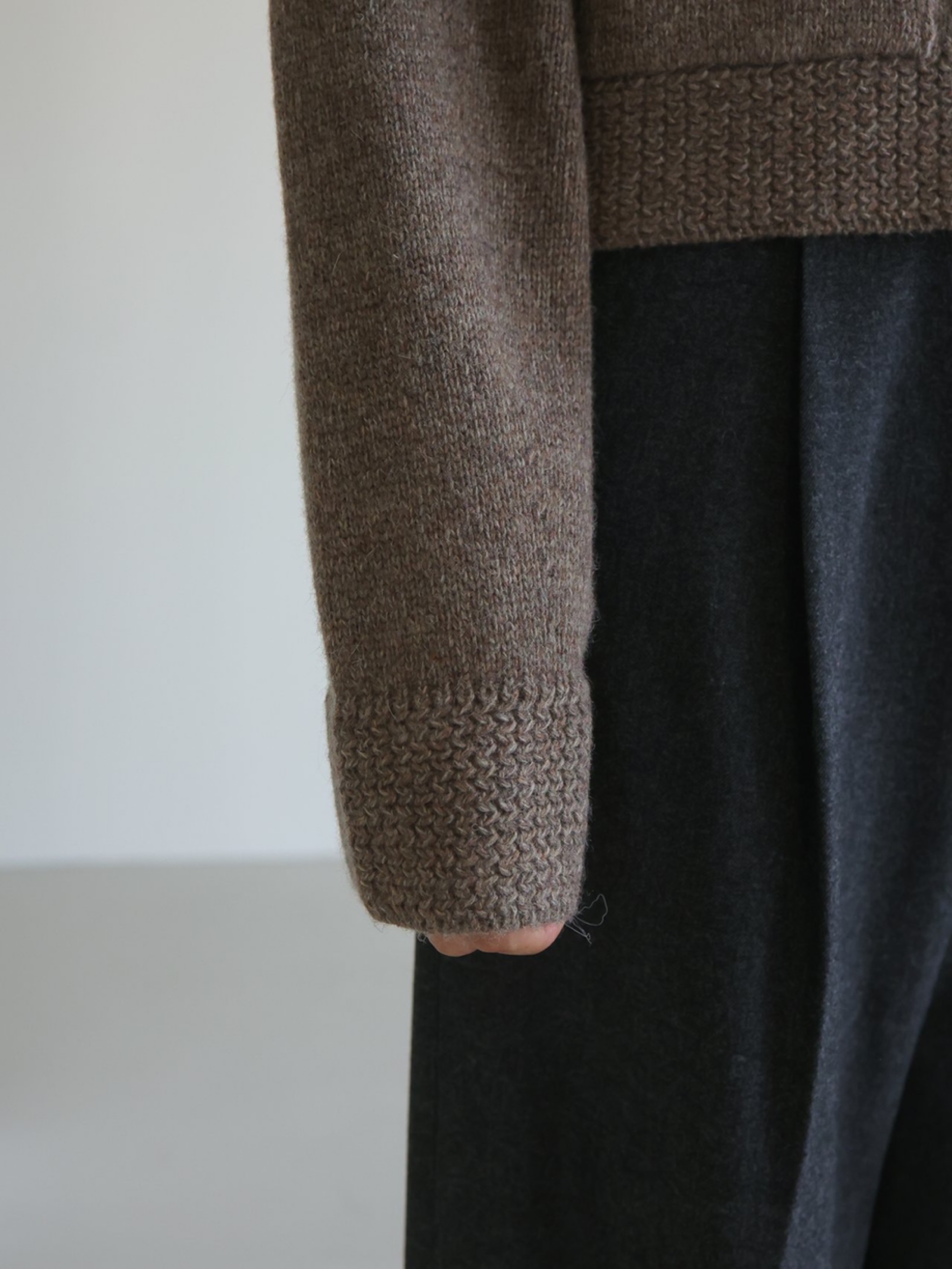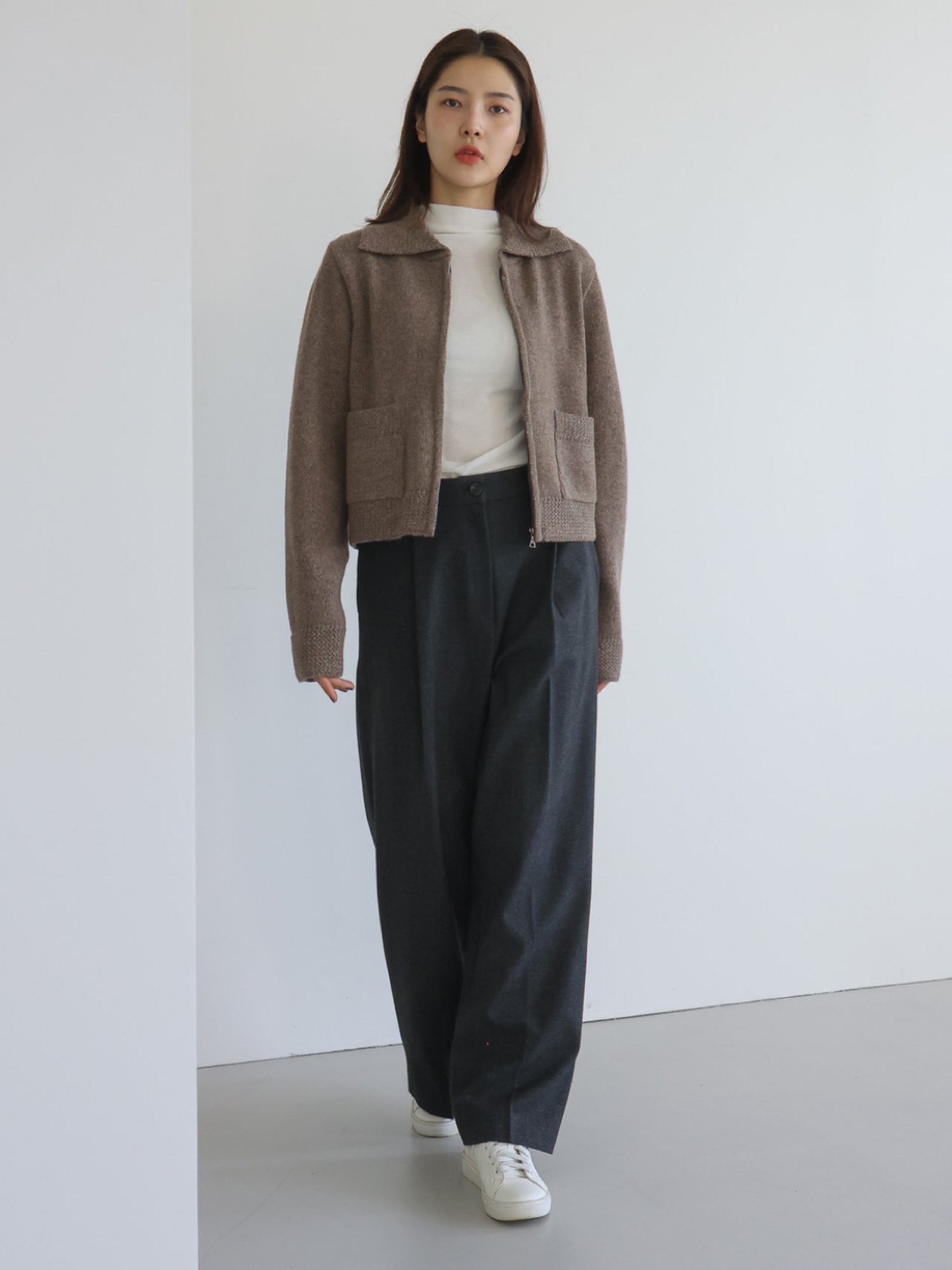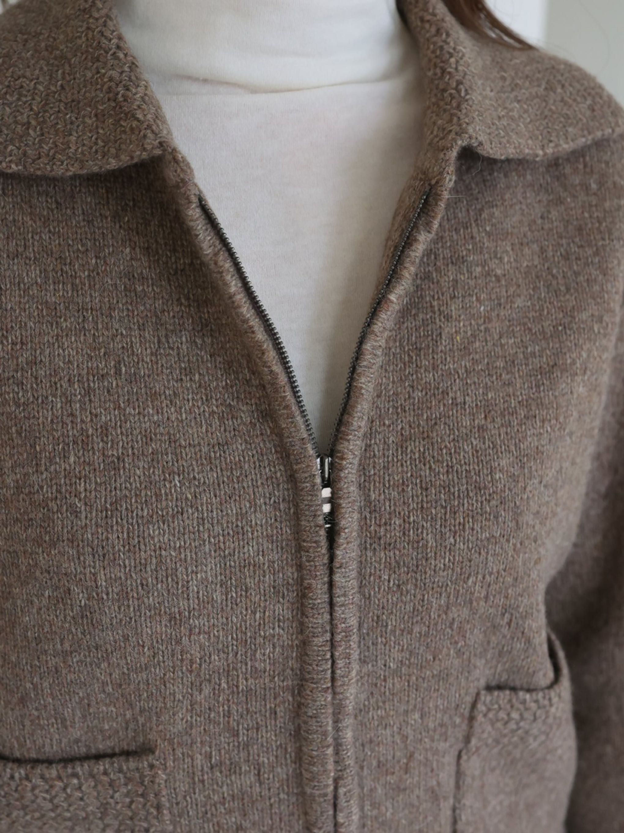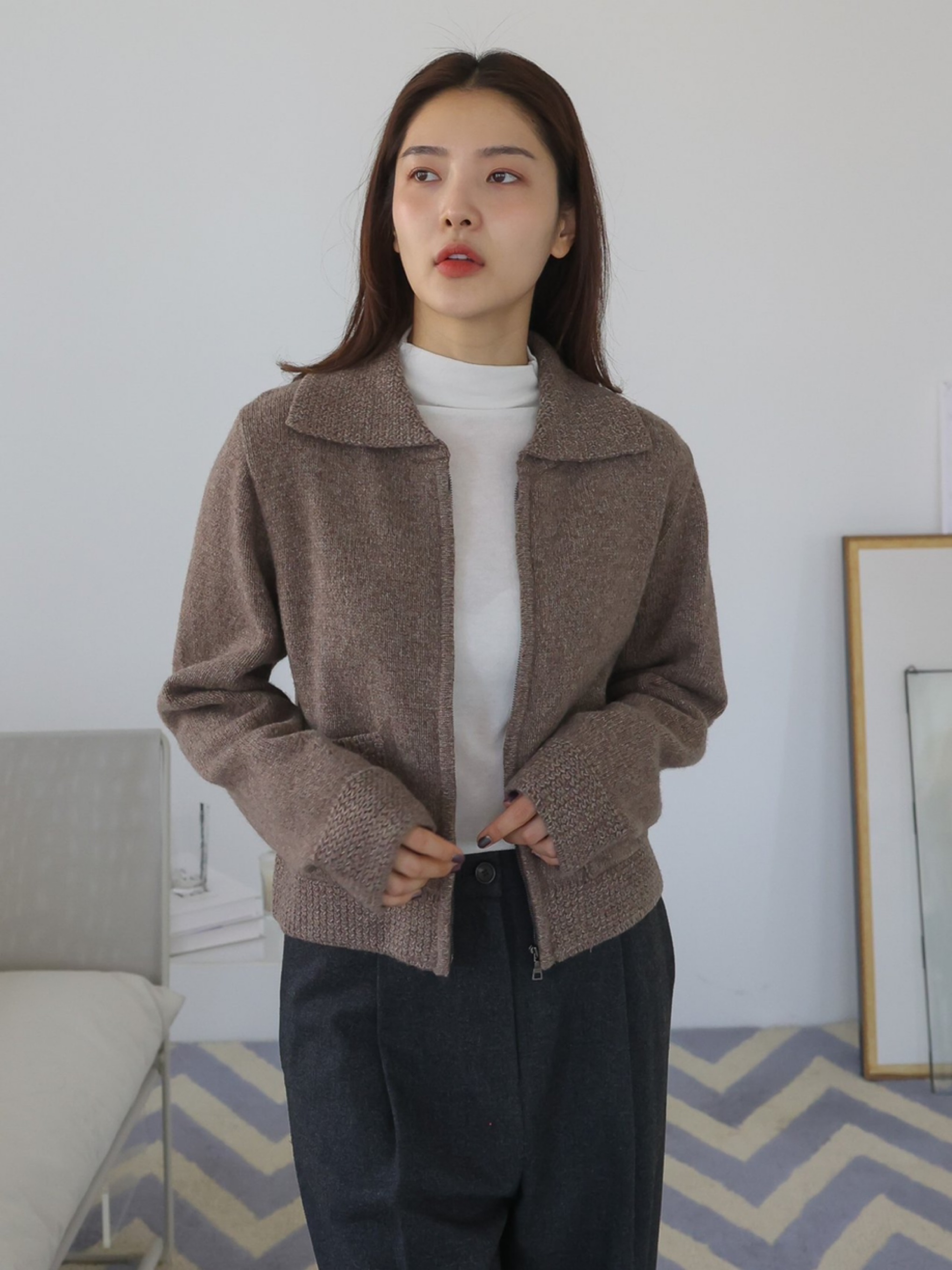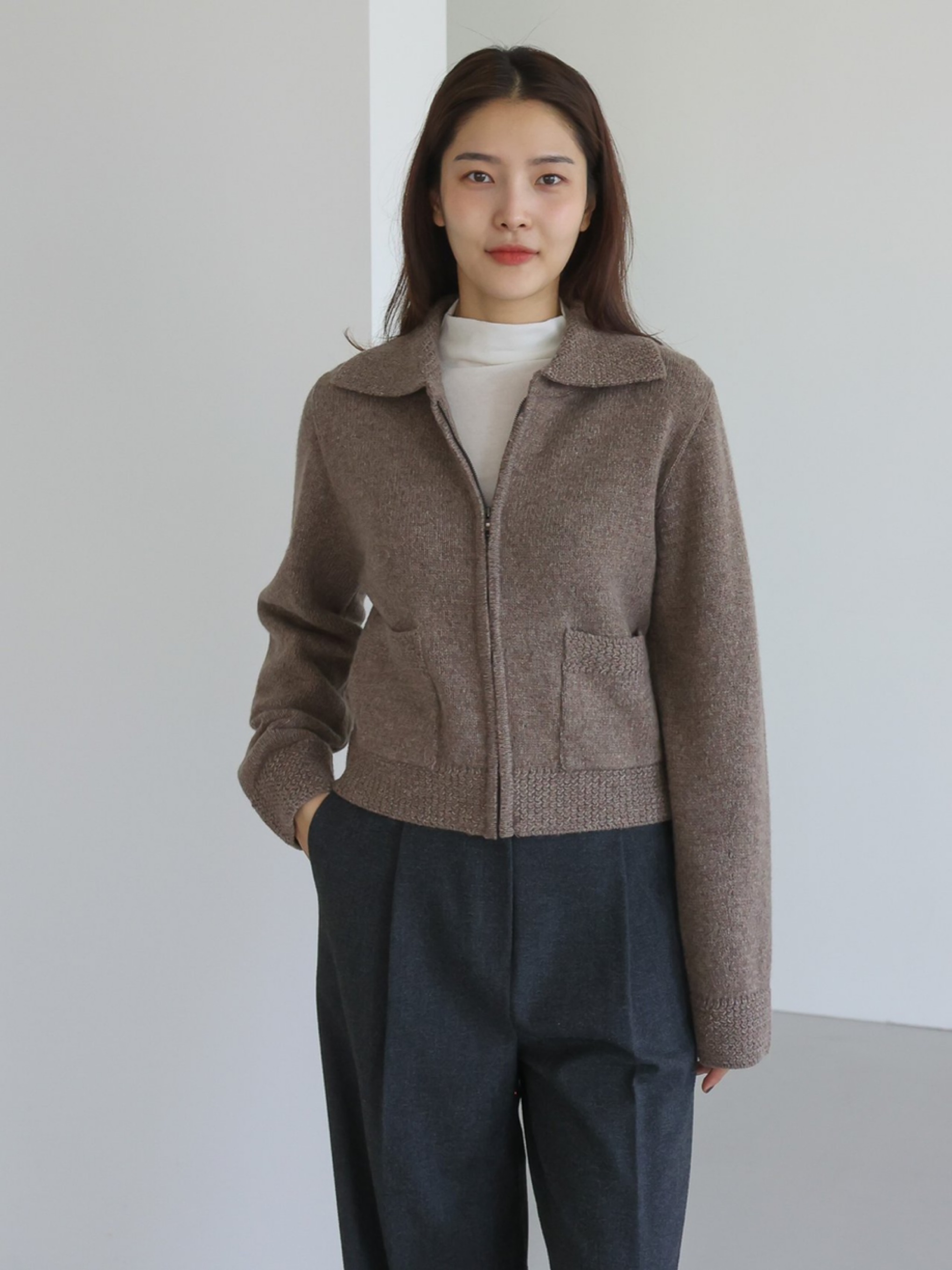 "고급 울 원사를 사용하여 따뜻하고 부드러운 착용감을 선사합니다. 잔잔한 몸판 조직감과 변형 케이블 조직감이 대비되어 포인트가 되는 집업 형태의 카라 가디건입니다."