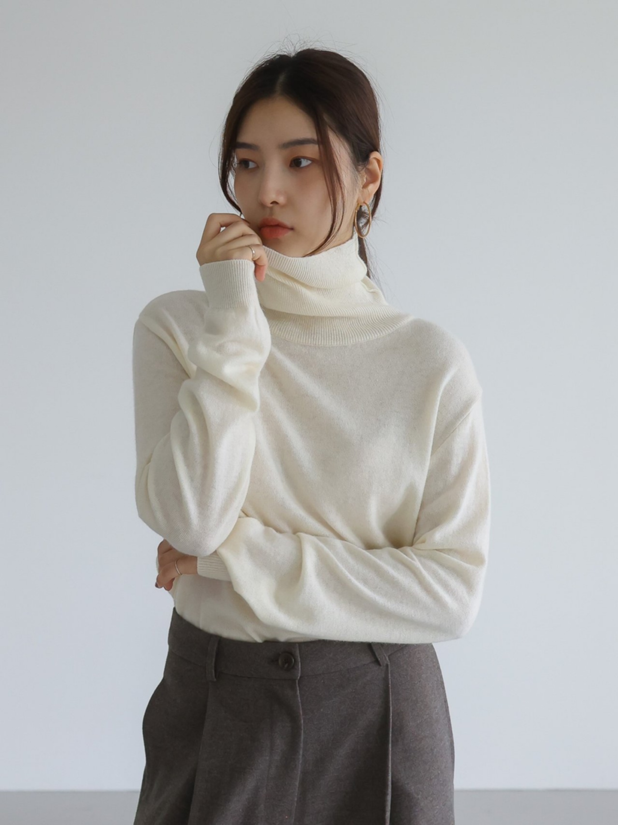"가볍고 포근한 터치감이 돋보이는 캐시미어 소재를 사용해 편안한 착용감을 전해주는 니트 탑입니다. 목을 부드럽게 감싸는 폴라디자인으로 보온성을 높였으며, 점차 추추워지는 날씨에 꼭 하나쯤은 있어야 하는 아이템입니다."