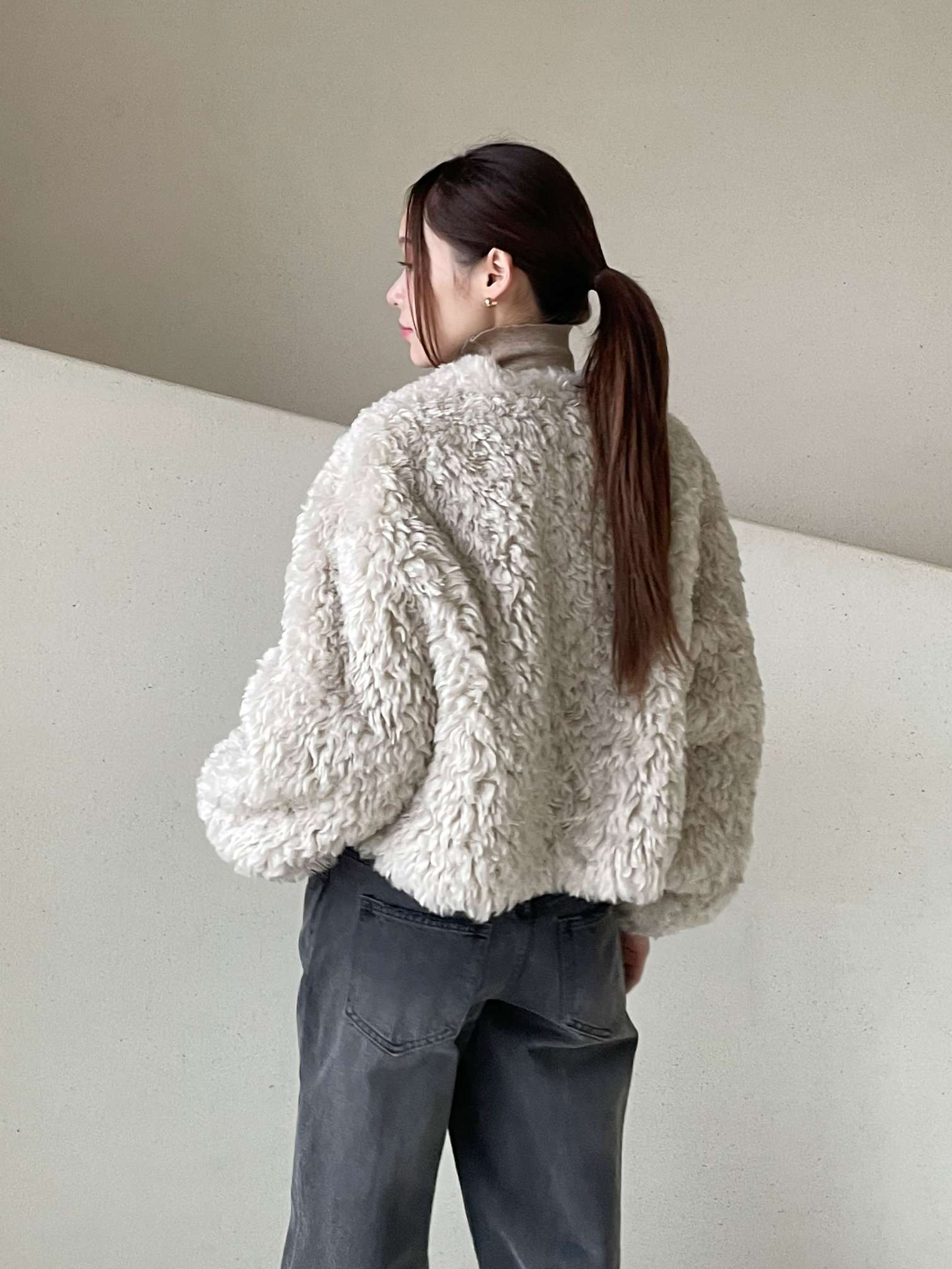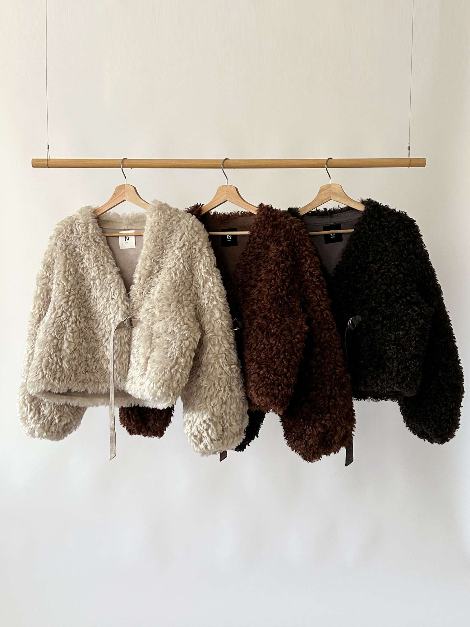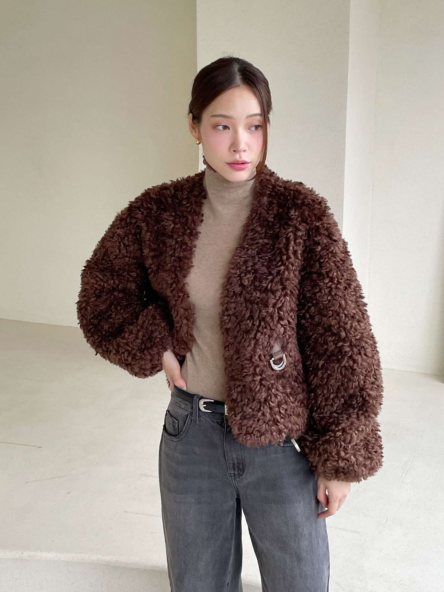 벨트로 여미는 디테일이 예쁜 에코퍼 부클쟈켓입니다 翻译